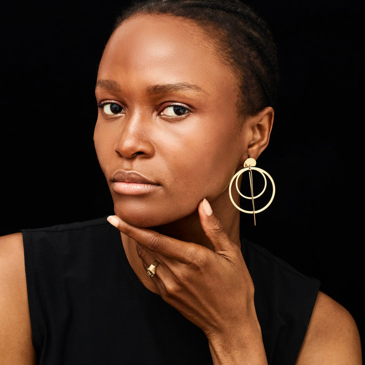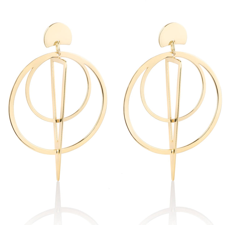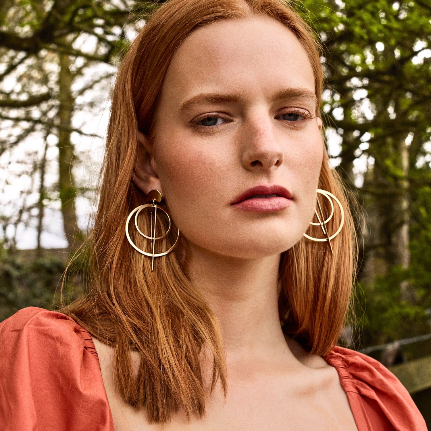 These Sundials - Gold by Toolally are lightweight, show-stopping dangle earrings. The large, sculptural design makes a bold statement while remaining comfortable to wear. Made in the UK from recycled sterling silver and hard-plated in 2.5 microns of 18ct gold, they are perfect for pairing with an up-do and a little black dress to really let them shine.
