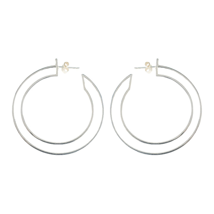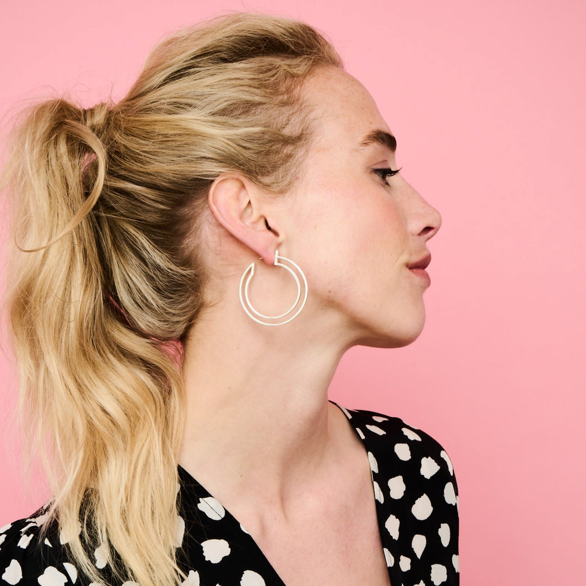 These Large Double Hoops - Silver by Toolally are a new twist on a classic hoop earring. These surprisingly lightweight earrings are cast in recycled sterling silver and are guaranteed to make a big impact. They are a multi-dimensional piece that will catch the light beautifully and are a perfect statement accessory.