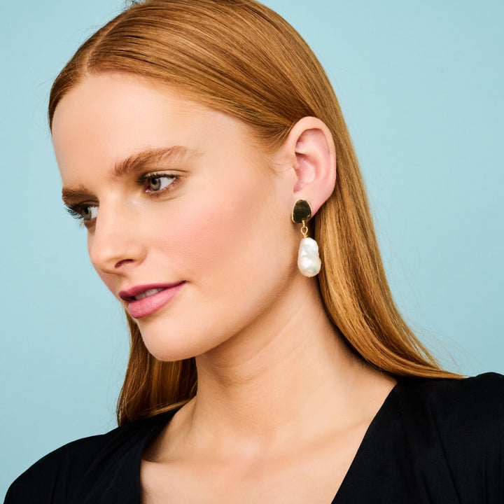 These earrings feature a large baroque flameball pearl. The ear tops are cast from solid brass and plated in 22-carat gold, with a solid silver ear post.