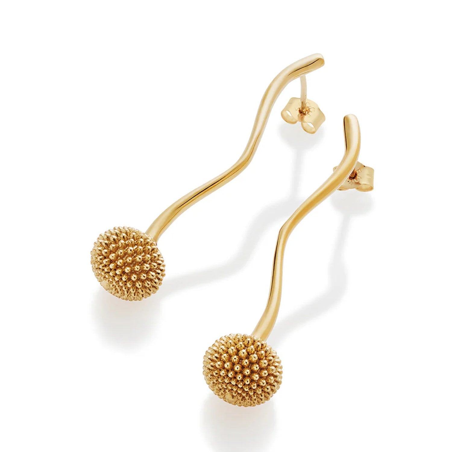 These drop earrings are made from 925 recycled sterling silver with a gold vermeil finish. The design is inspired by the Craspedia flower.