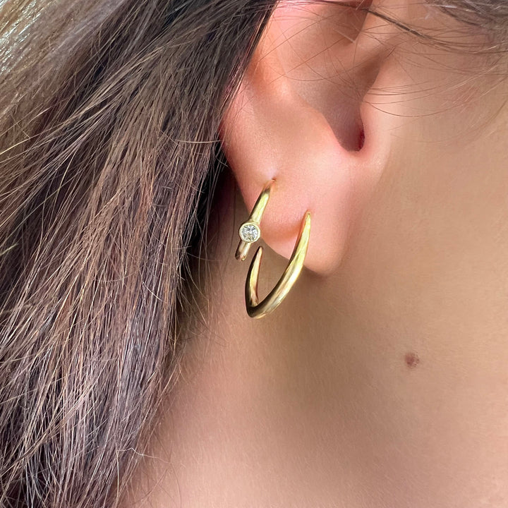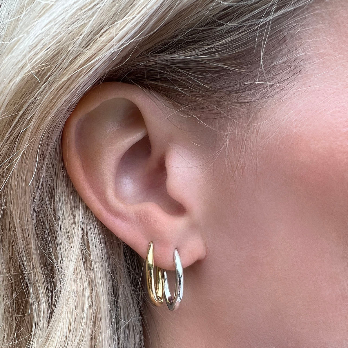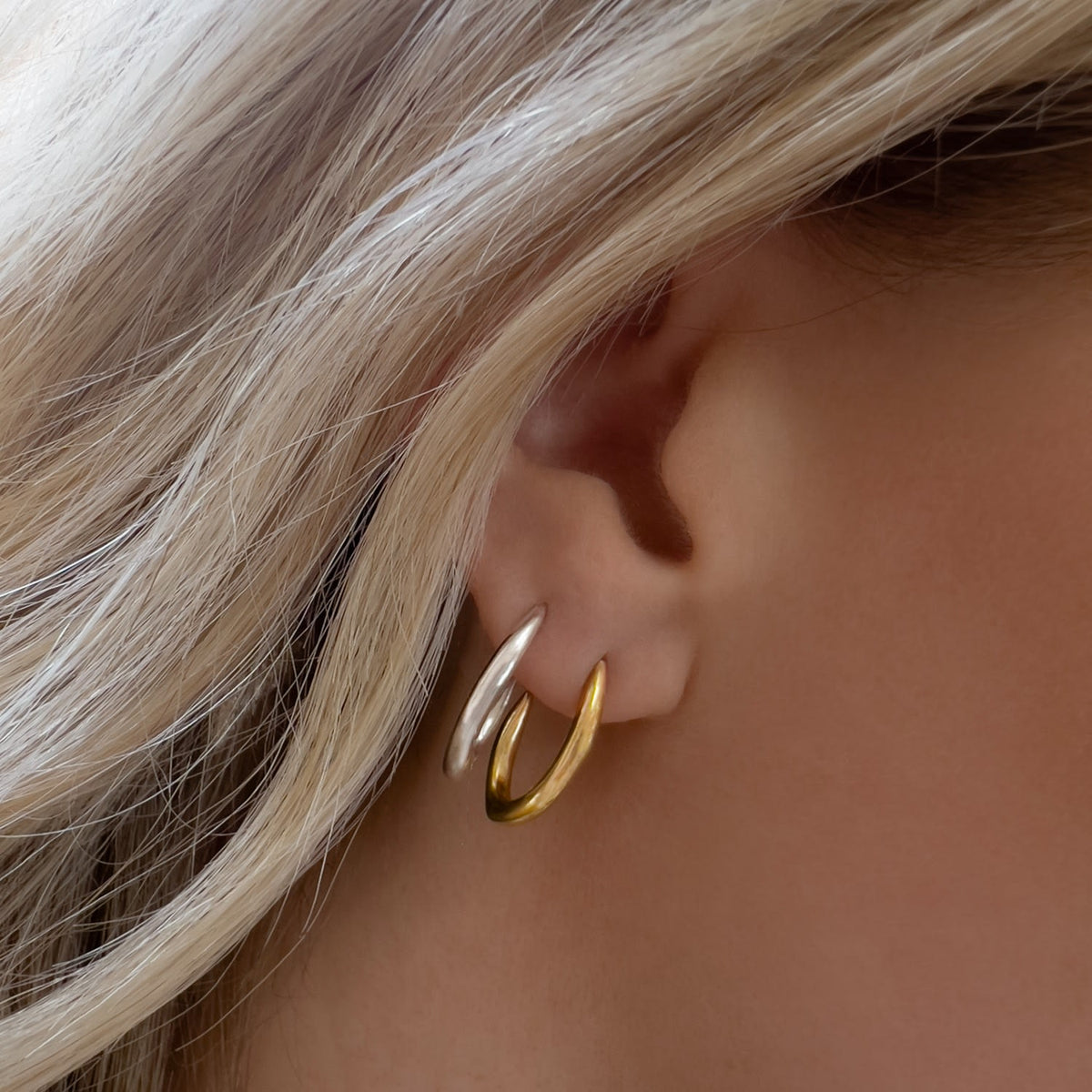 These Zelda Gold Hoop Earrings by Tory Long are a classic wardrobe staple with a modern twist. Their unique tapered edges and gentle curves redefine the traditional hoop, creating a versatile piece that can elevate any everyday look. Perfect for creating a curated ear, these hoops can be layered with other earrings for a personalized style. They symbolize a fresh and elegant approach to timeless design, handcrafted with care in Belfast, Northern Ireland.
