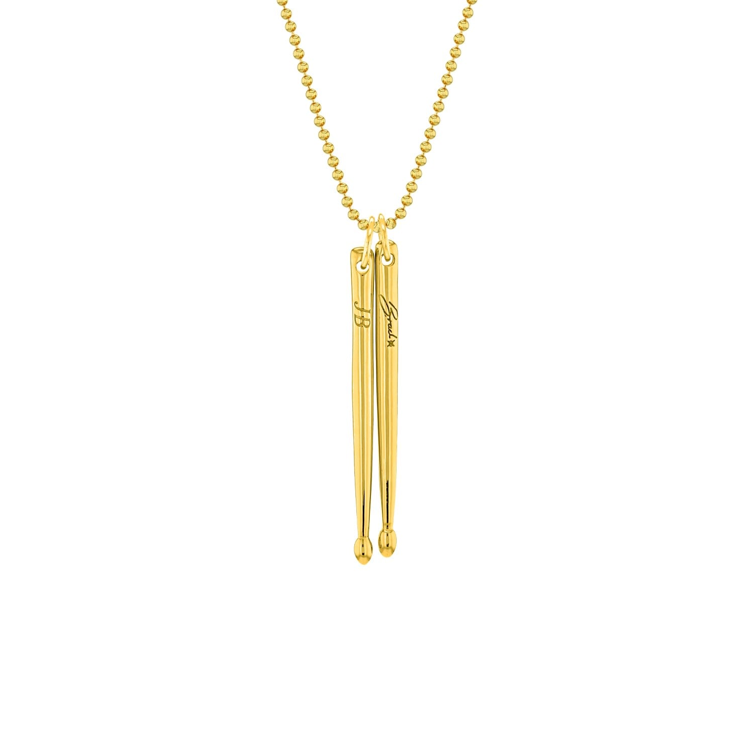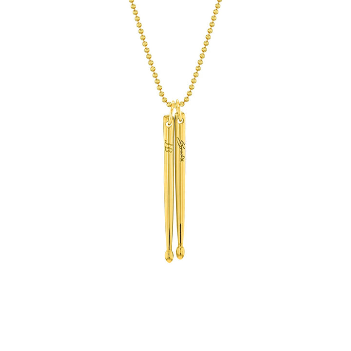 This Drumsticks Pendant Designed & Signed By Drummer John Brad Bradbury by True Rocks is a unique and edgy accessory. Designed by legendary drummer John "Brad" Bradbury, this pendant is cast in sterling silver and 18ct yellow gold plated. It features Bradbury's signature and initials on each stick, making it a truly personal piece.