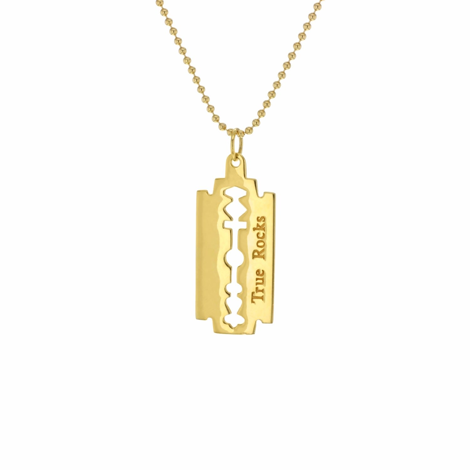 This Razor Blade Pendant by True Rocks is an iconic and edgy statement piece. Its bold design, cast in sterling silver and finished with a luxurious gold plating, gives it a rebellious yet polished aesthetic. This pendant is for those who dare to be different, symbolizing a sharp sense of style and a fearless attitude. It’s a perfect accessory to add a touch of unapologetic flair to your look.