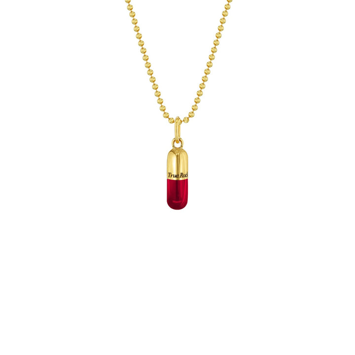 This Red & 18Kt Gold Plated Small Pill Pendant by True Rocks is a bold and rebellious statement piece. Its pill shape and translucent red enamel give it a playful and edgy aesthetic, perfect for someone who wants to release their inner punk. This pendant is a fun and unique accessory that adds an unconventional and confident flair to your style.