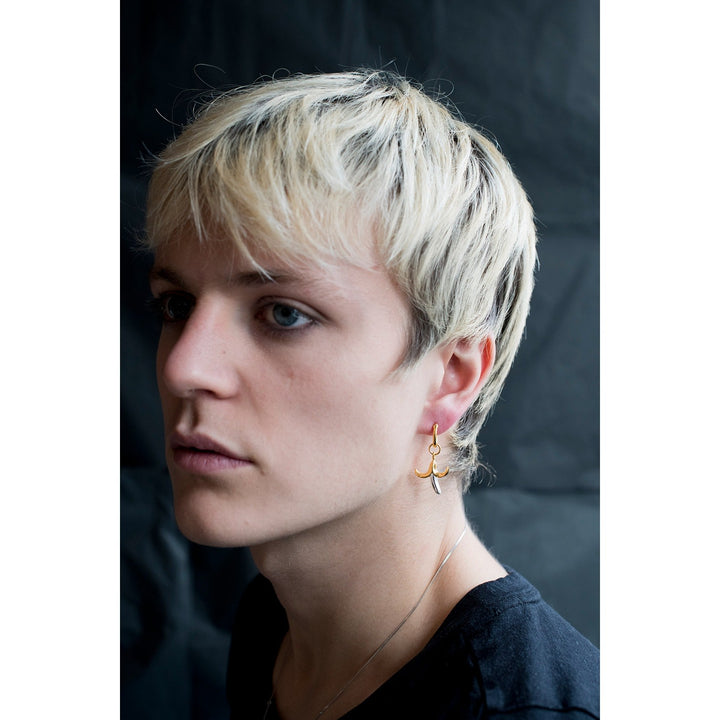 These earrings feature a two-tone banana charm cast in sterling silver and 18 carat gold-plated material. They hang from a gold-plated hoop earring.