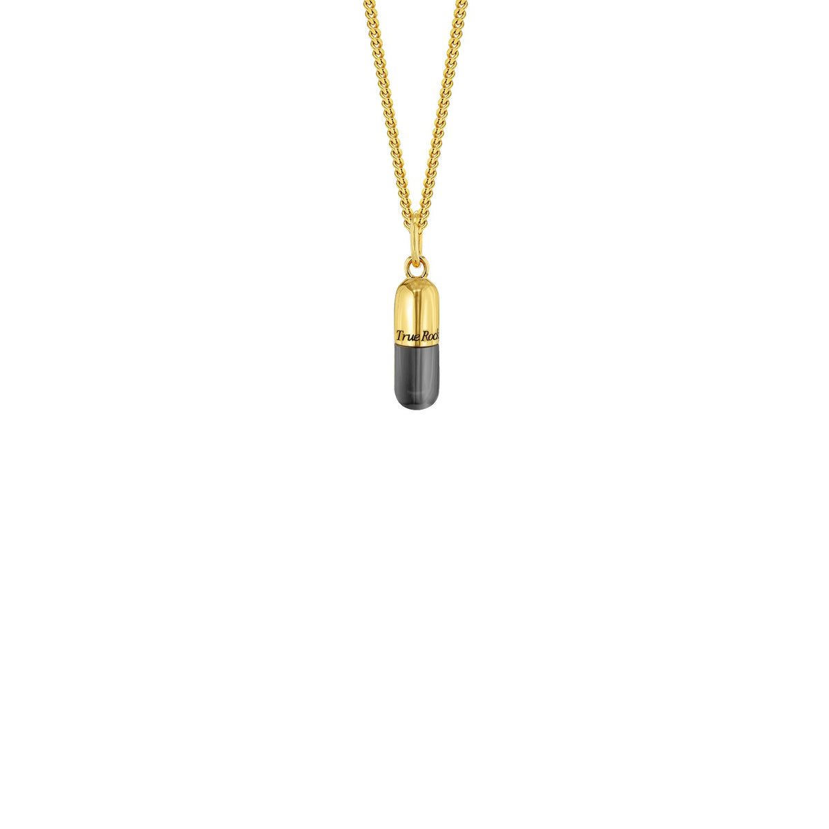 This Turquoise Enamel & Gold Plated Mini Pill Pendant by True Rocks is a playful and vibrant accessory. Cast in sterling silver, this mini pill is plated with 18k gold and overlaid with a striking turquoise enamel. It's a fun, modern piece that can be worn on an adjustable fine chain or on a hoop earring, offering a fresh pop of color and a unique statement.