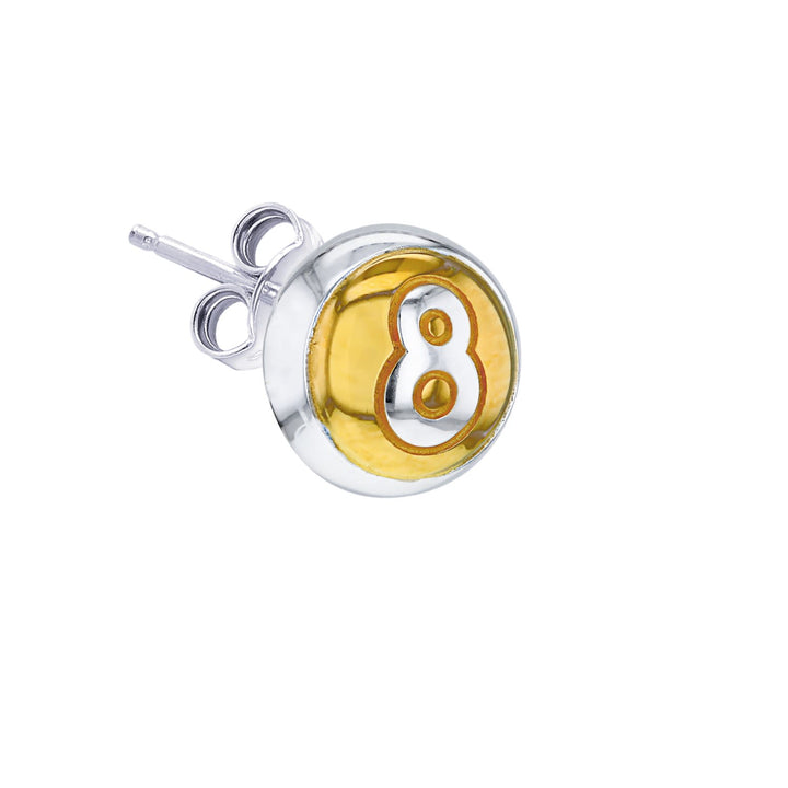The New 2-Tone 8 Ball Mini Pendant by True Rocks is a distinctive and stylish accessory. It features a miniature 8-ball pendant cast in solid sterling silver with 18kt gold-plated detail. The pendant hangs from a sterling silver adjustable fine chain. It can also be worn on a hoop or purchased as a stud earring.