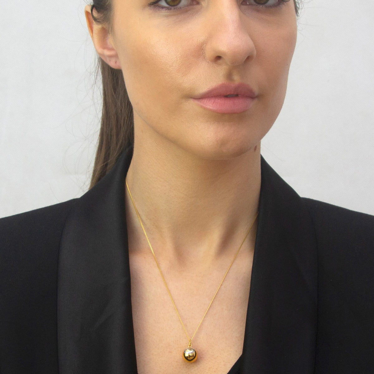 This pendant necklace is made of solid sterling silver with 18kt gold-plated detail. The chain is adjustable.