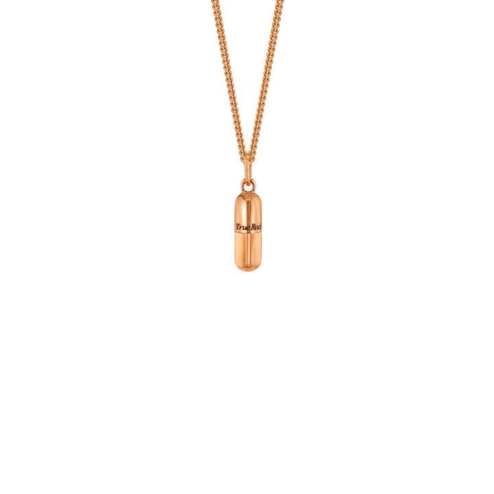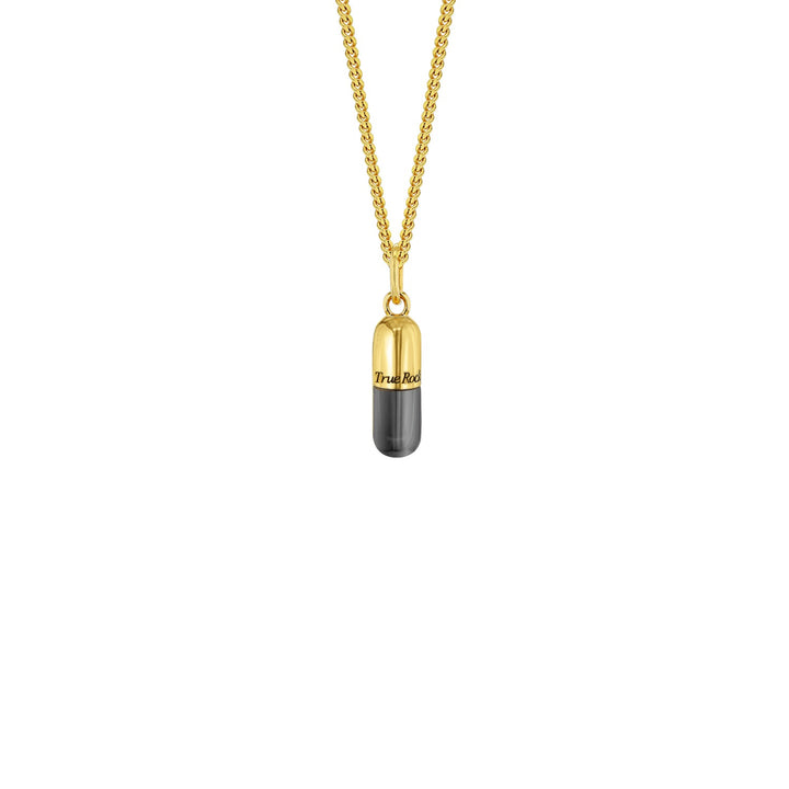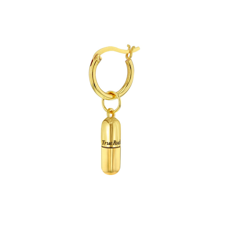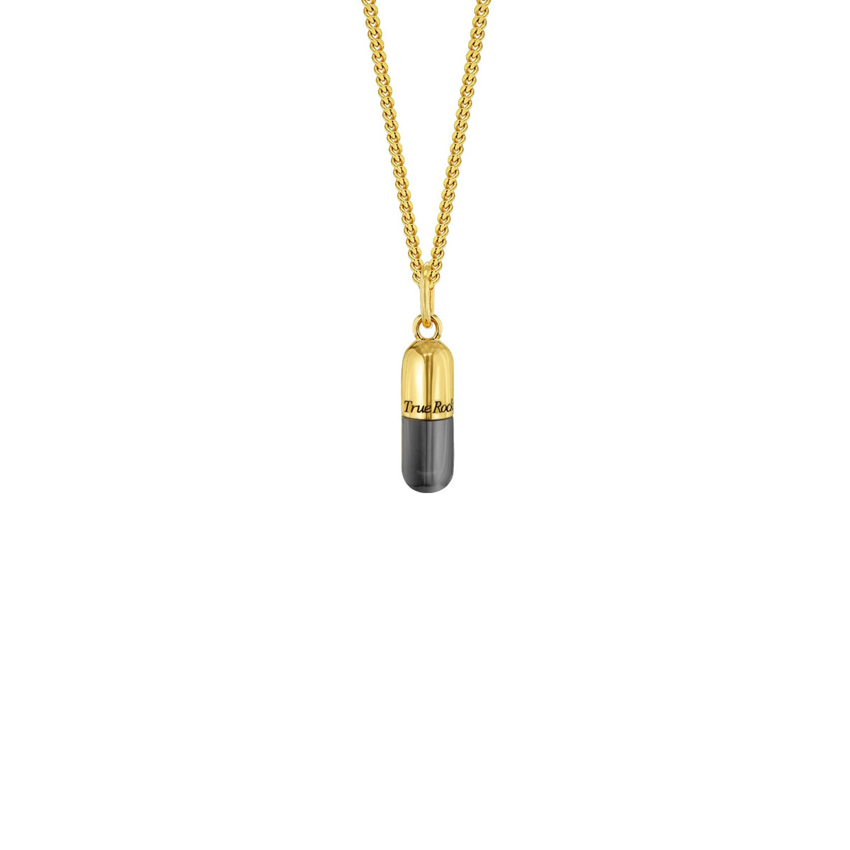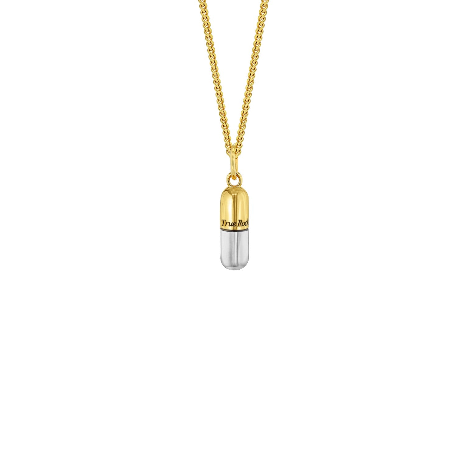 This 18Kt Gold Plated Mini Pill Pendant by True Rocks is a stylish and playful addition to their signature collection. Cast in solid sterling silver and plated in 18kt gold, this mini pendant offers a unique and edgy aesthetic. Its versatility allows it to be hung on a necklace or a hoop earring, making it a fun and modern accessory.