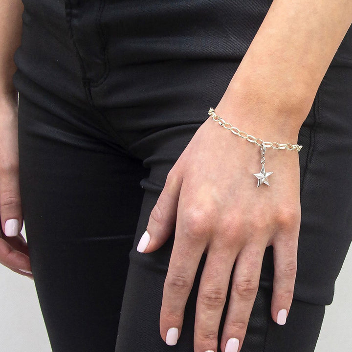 This bracelet is cast in sterling silver and includes a sterling silver mini star charm. It is also available in 18kt gold-plated.