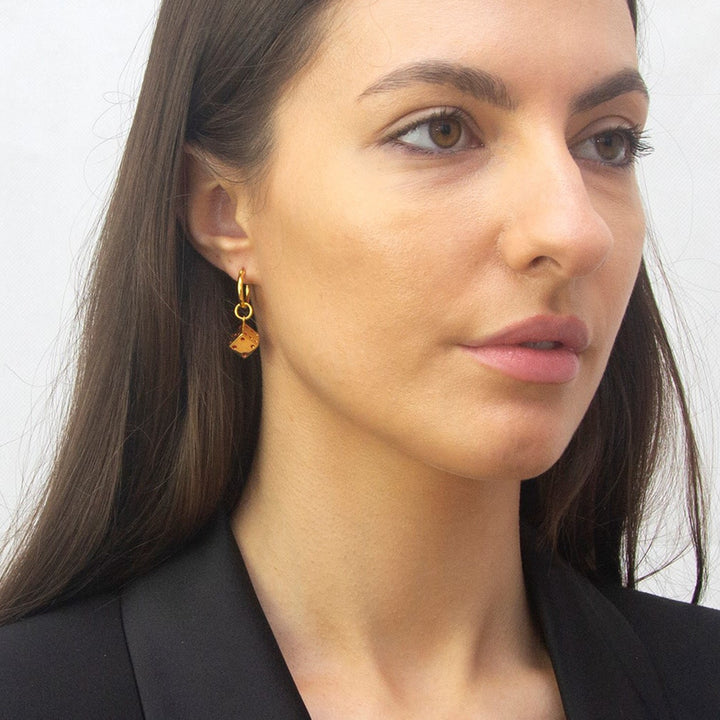 This earring features a mini dice charm cast in solid sterling silver with 18kt gold plating and translucent red enamel. It hangs on an 18kt gold-plated huggie hoop earring.