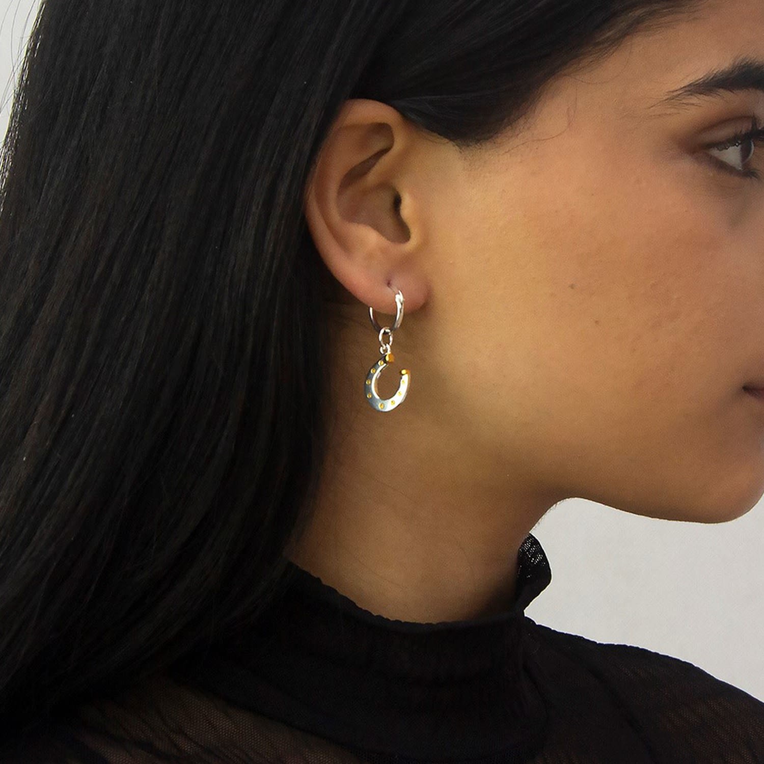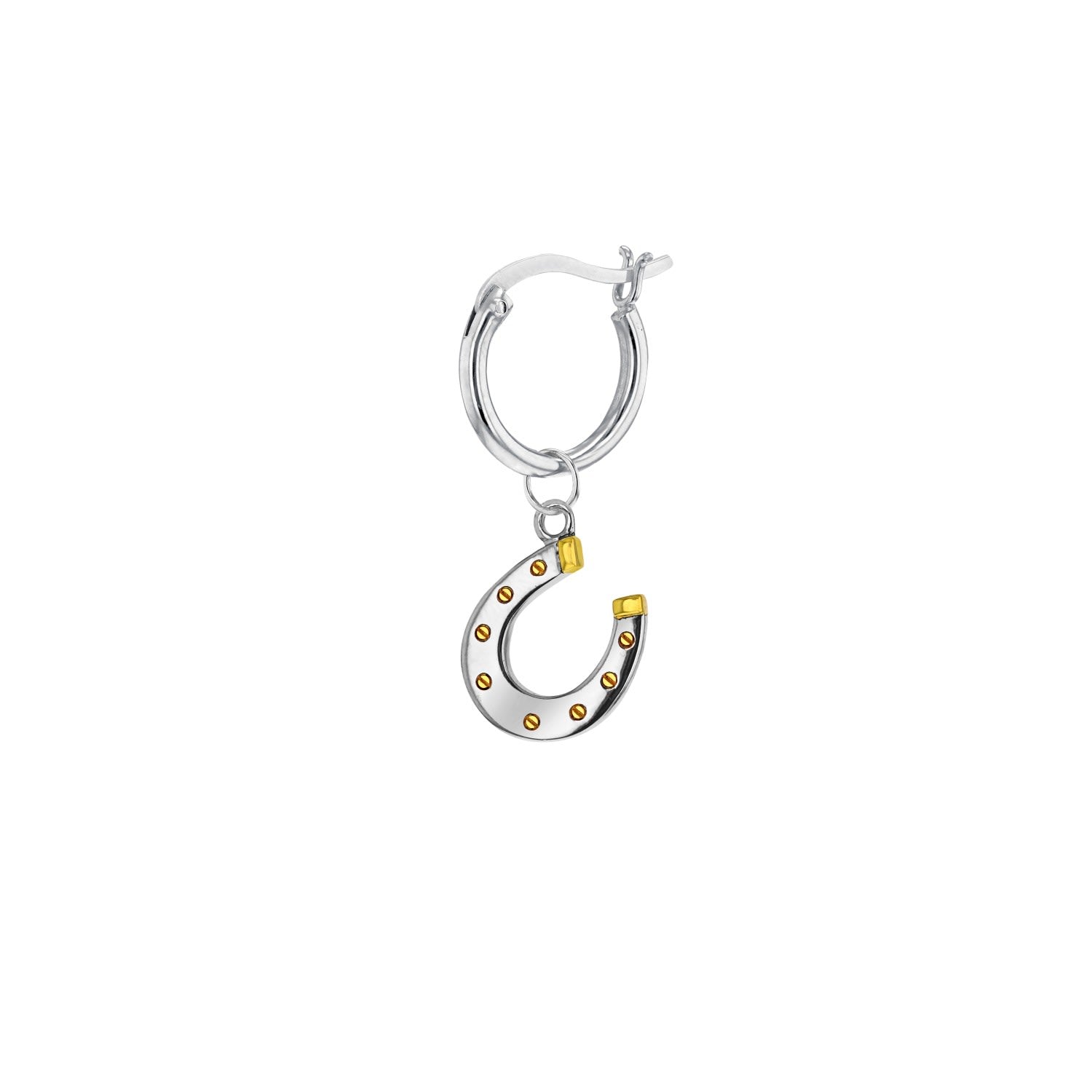 The 2 Tone Sterling Silver & 18Kt Gold Plated Mini Horse Shoe Charm On Sterling Silver Hoop Earring by True Rocks is a unique accessory. The mini horseshoe charm is cast in sterling silver with 18kt gold plated detail. It hangs on a sterling silver hoop earring and is sold as a single. The charm can also be hung on a chain.