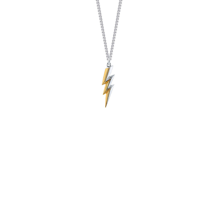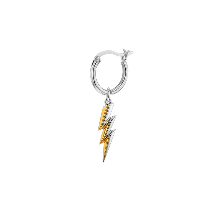 This earring features a lightning bolt charm cast in solid sterling silver with 18kt gold plated detail, hanging on a sterling silver hoop earring. It is sold as a single.