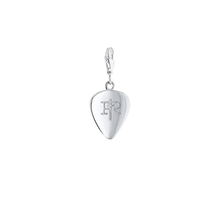 This bracelet is cast from solid sterling silver with a rhodium plating. It features a solid sterling silver mini plectrum charm.
