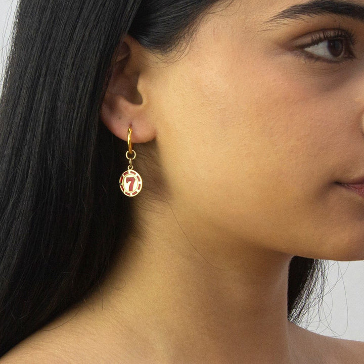18Kt Gold Plated & Red Enamel 7 Poker Chip Charm On Gold Plated Hoop Earring
