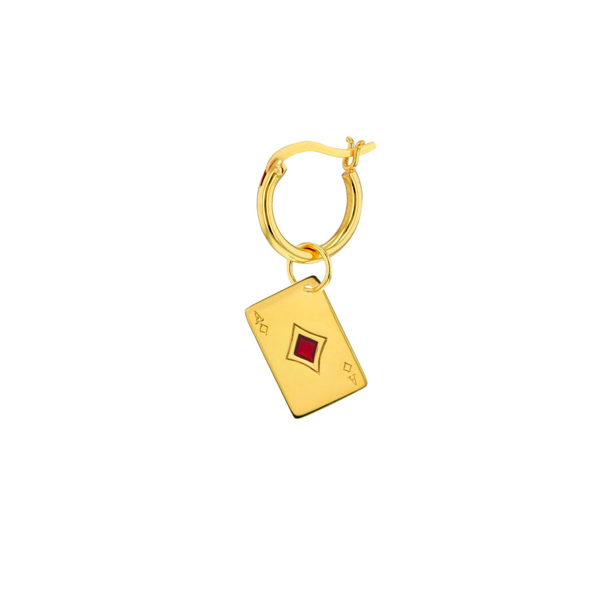The 18Kt Gold-Plated & Red Enamel Ace Of Diamonds Mini Pendant by True Rocks is a part of their Las Vegas Collection. This mini pendant features a miniature Ace of Diamonds charm, cast in solid sterling silver, plated with 18k gold, and overlaid with translucent red enamel. The charm can also be worn on a huggie hoop earring, offering versatility.