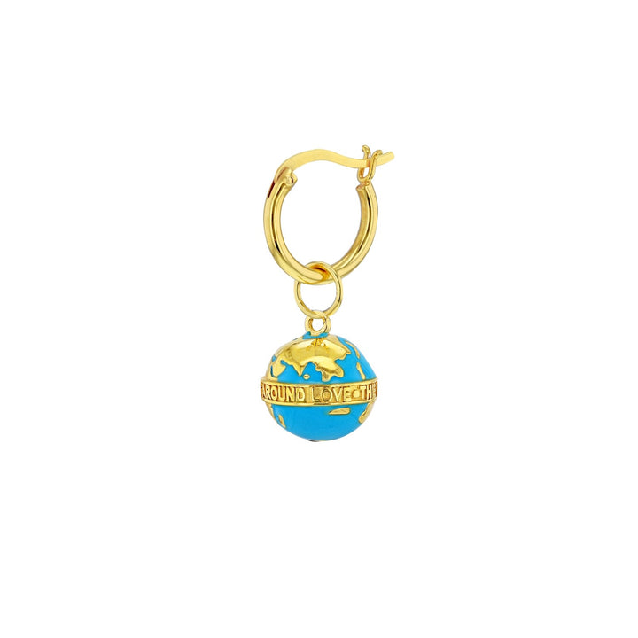 The Turquoise Enamel & 18Kt Gold Plated Globe Earring On Gold Hoop by True Rocks is a modern and striking earring sold as a single. The distinctive globe design, with the words "The whole world revolves around love" written through the center, hangs on an 18-carat gold-plated huggie hoop. It's a statement piece with a meaningful message.