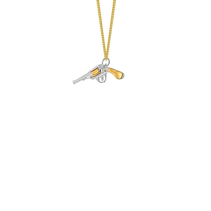 The 2-Tone Sterling Silver & 18Kt Gold-Plate Mini Pistol Charm On Gold Hoop by True Rocks is a unique and bold earring, sold as a single. It features a mini pistol charm cast in solid sterling silver with 18kt gold-plated detail. It hangs on a gold-plated hoop and can also be worn as a necklace.