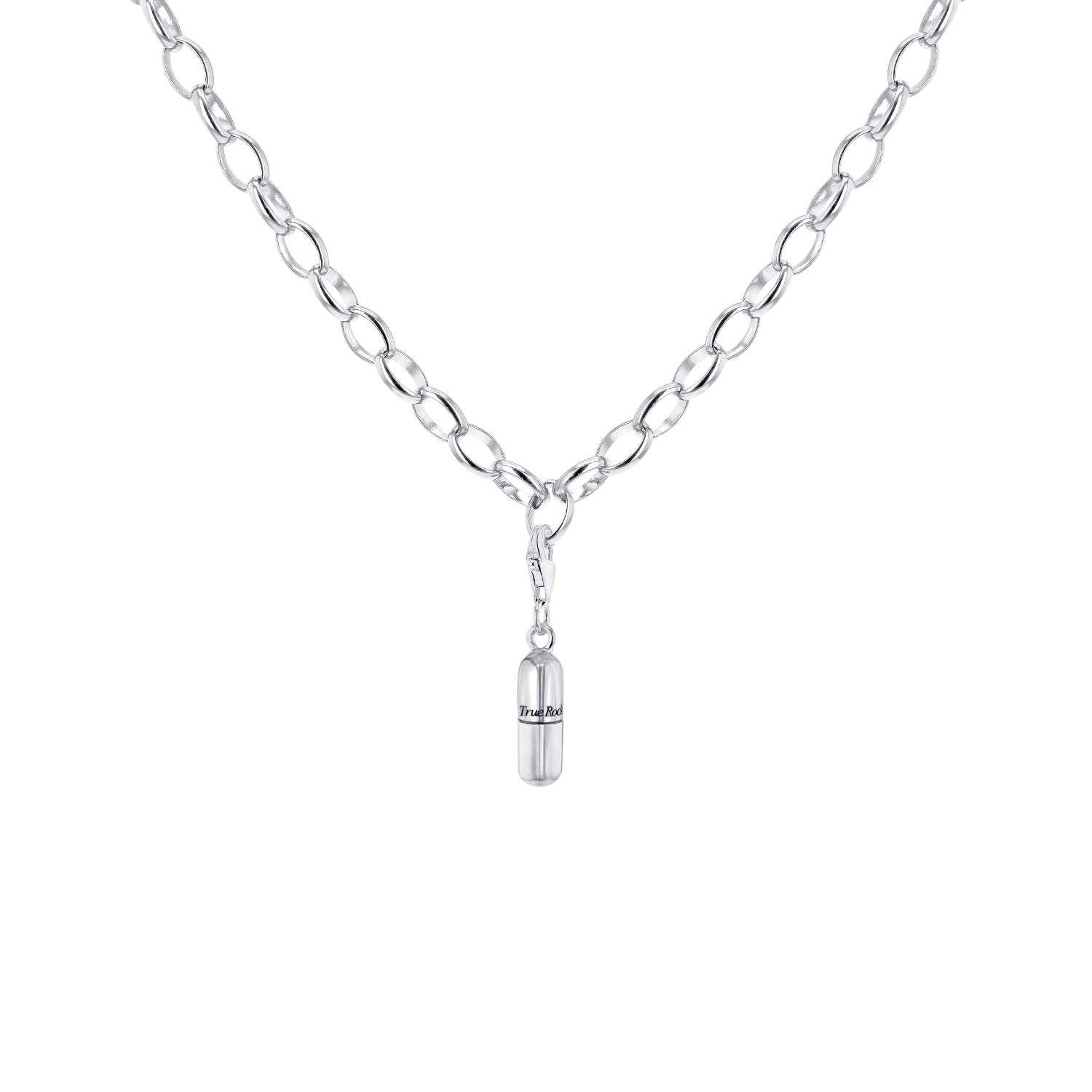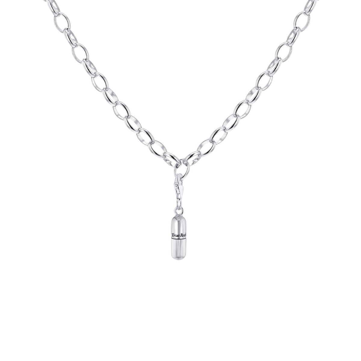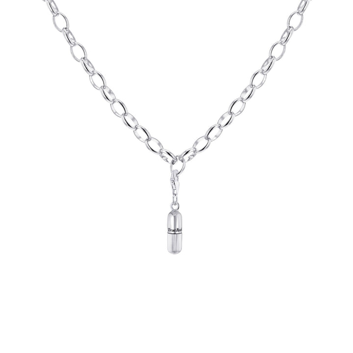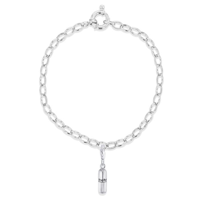This Sterling Silver Mini Pill Charm by True Rocks is a unique and edgy accessory. Cast in solid sterling silver, this signature pill charm is perfect for starting a True Rocks charm collection. It can be mixed and matched with other charms or hung on a chain to create a bespoke, statement piece. The bold design and high-quality material make it a standout addition to any jewelry collection.