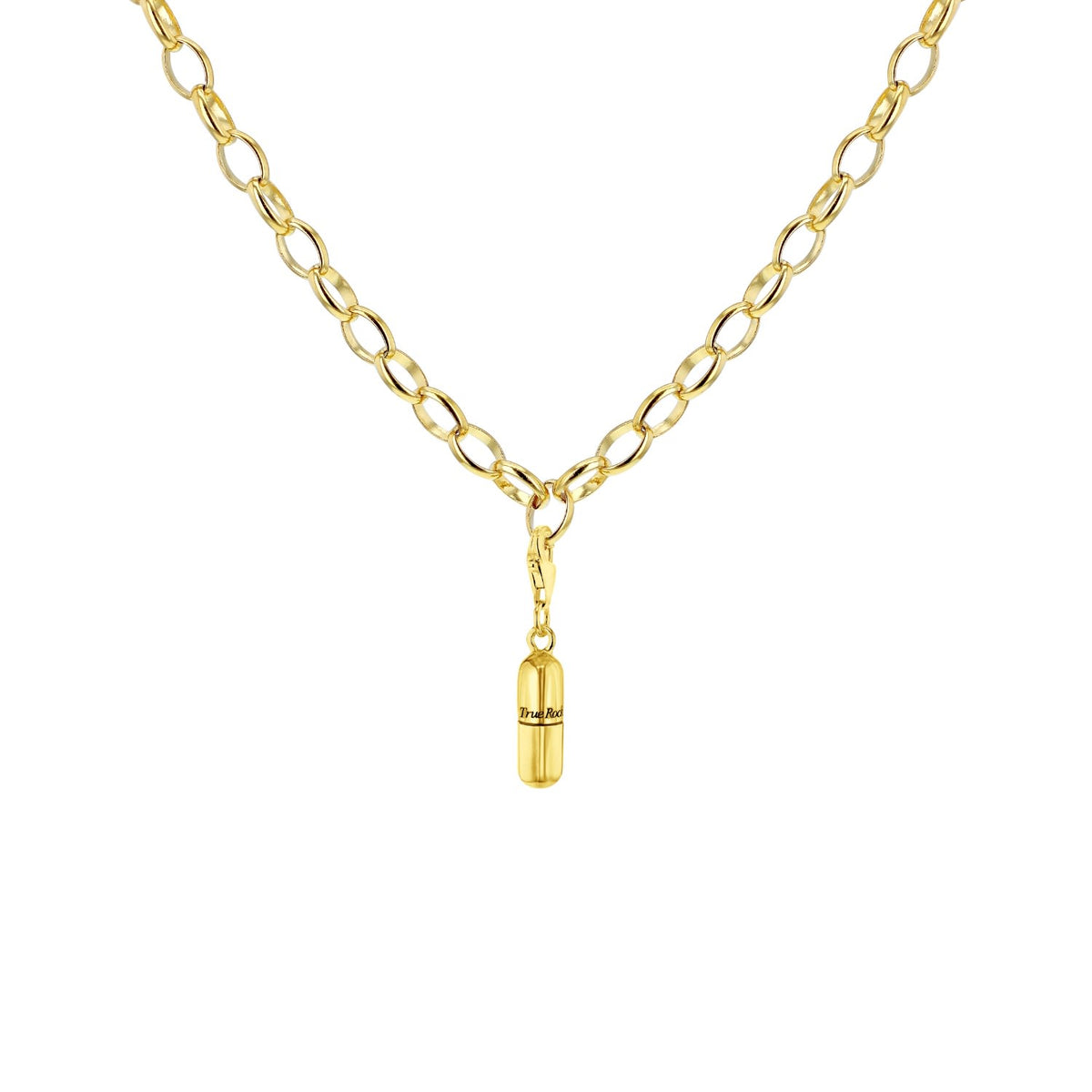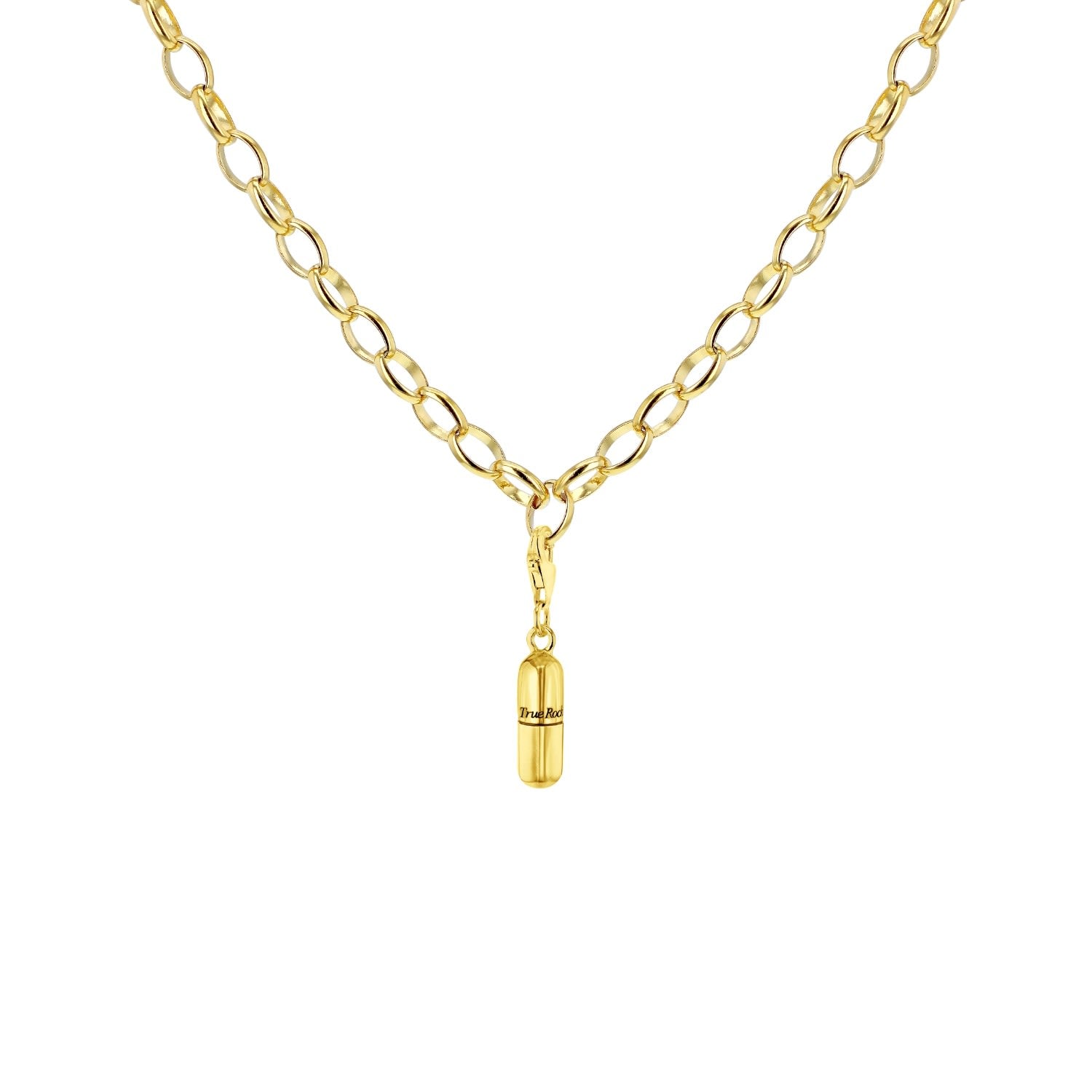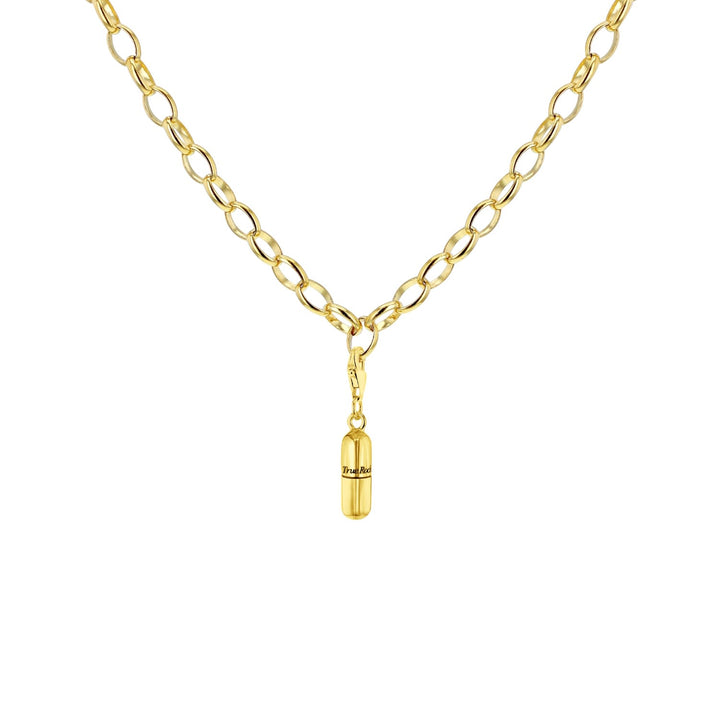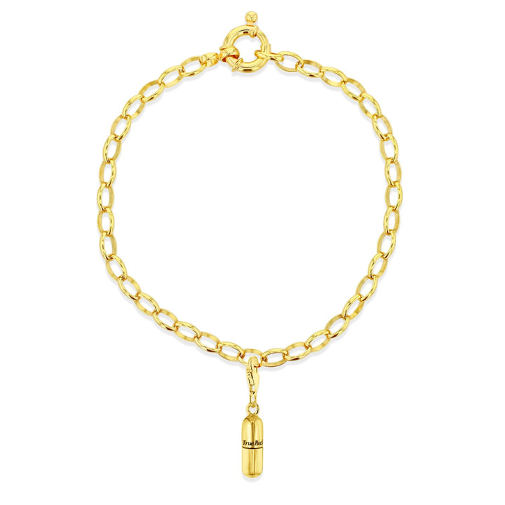 The 18Kt Gold-Plated Mini Pill Charm by True Rocks is a signature charm for starting a collection. Cast in solid sterling silver and 18Kt Gold Plated, it can be added to a charm bracelet or worn individually on a necklace chain. It offers a modern and striking look.