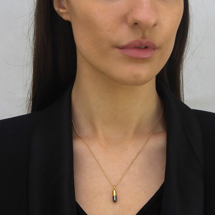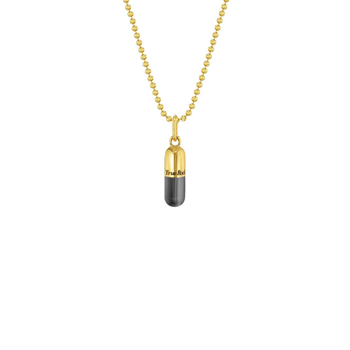 The Small Pill Pendant 2 Tone 18 Kt Gold Plated & Gunmetal Grey On Gold Chain by True Rocks is a stunning twist on the brand's signature collection. This small pendant is cast in solid sterling silver and is overlaid with both an 18k gold plate and gunmetal grey, creating a beautiful contrast. It is a bold and stylish accessory.