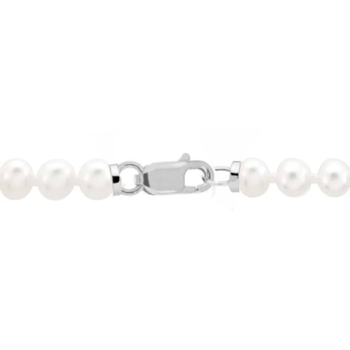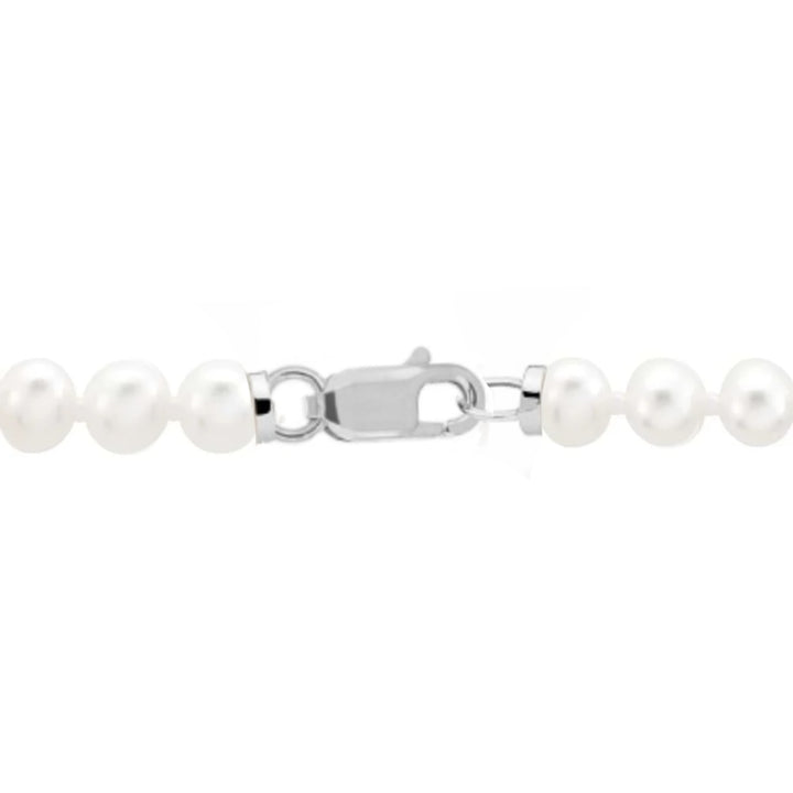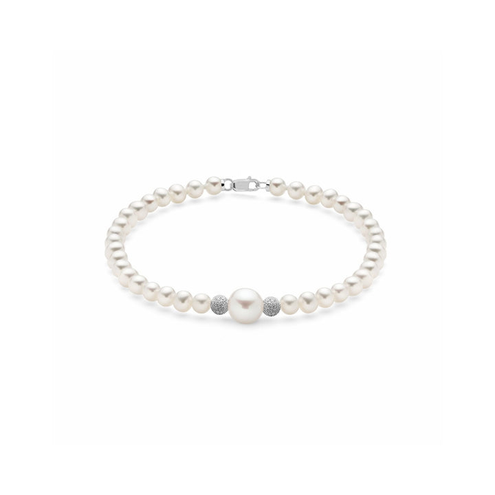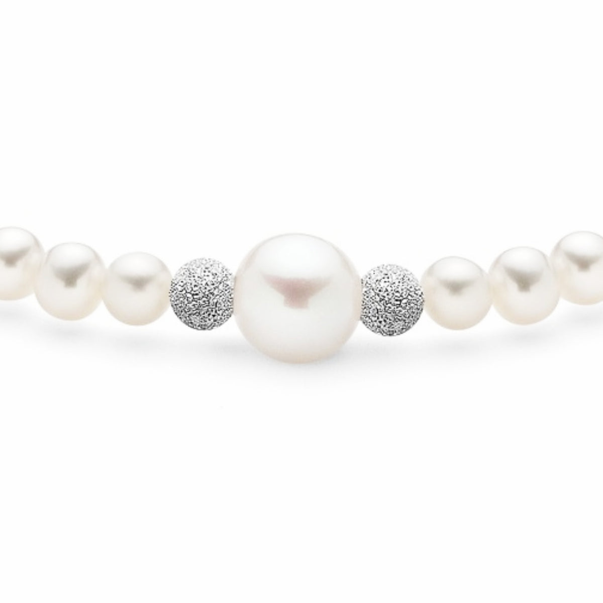 Crafted from 18-karat white gold, this bracelet showcases natural freshwater pearls in 4mm and 8mm sizes. It has a secure lobster clasp and two solid 18-karat white gold spheres.