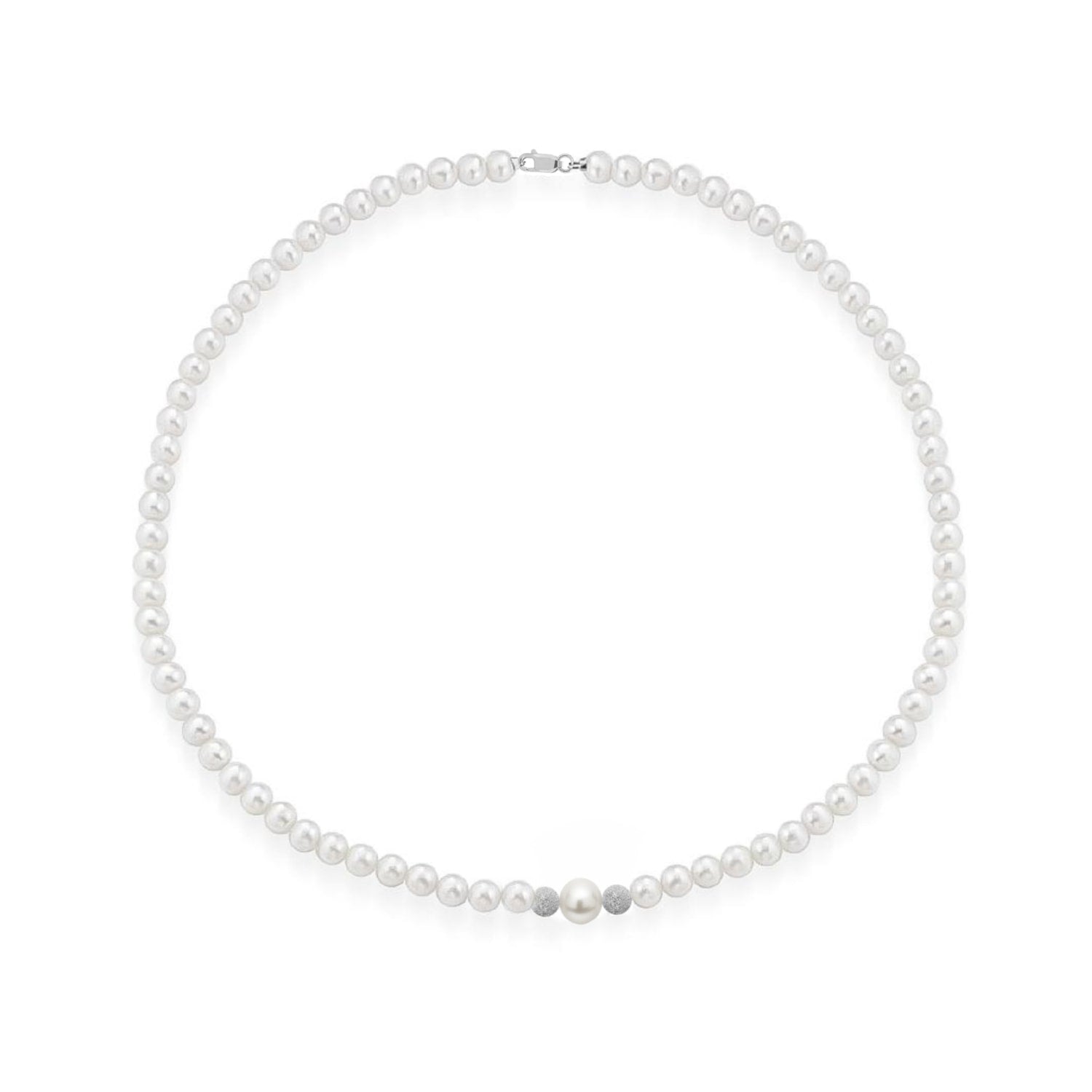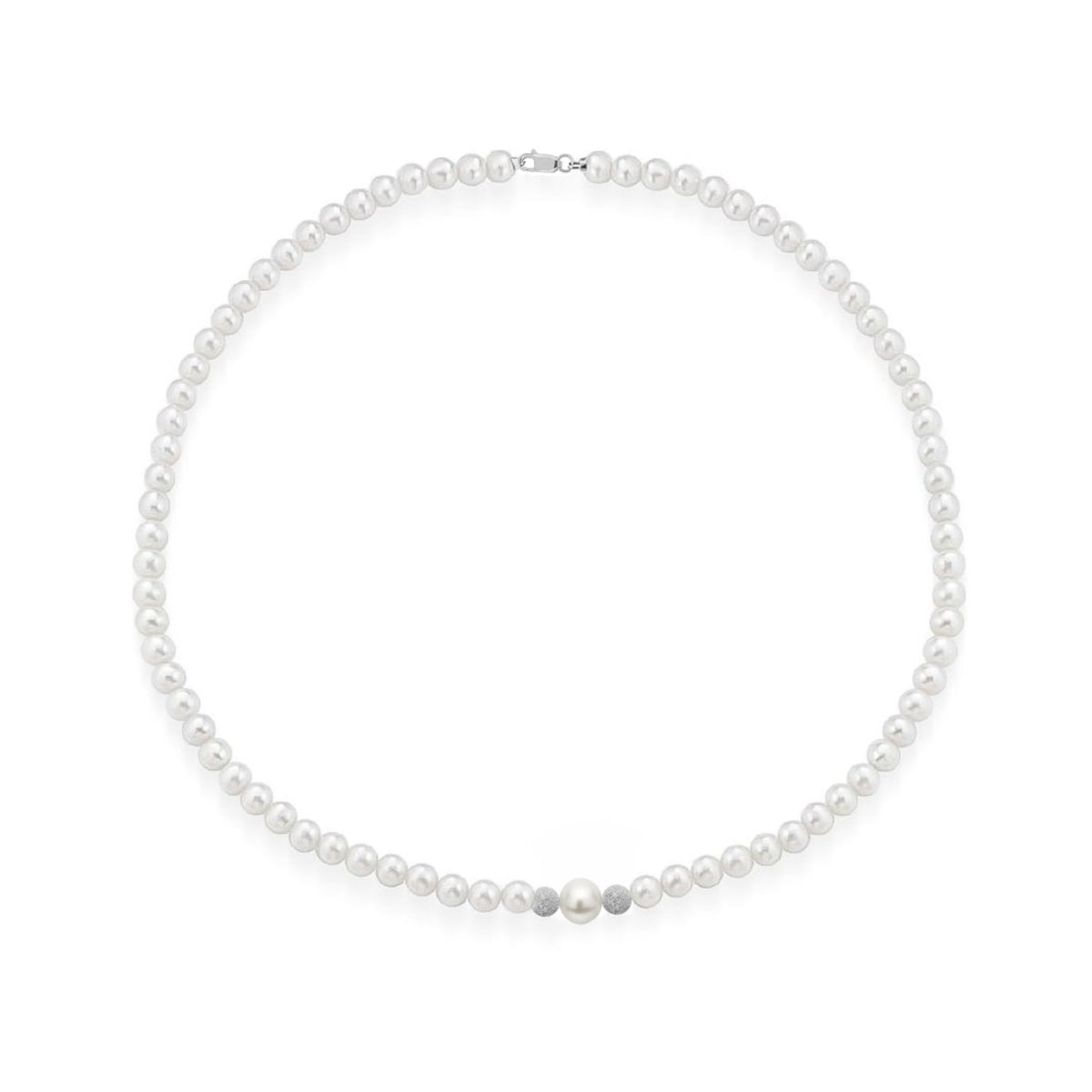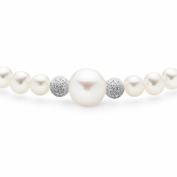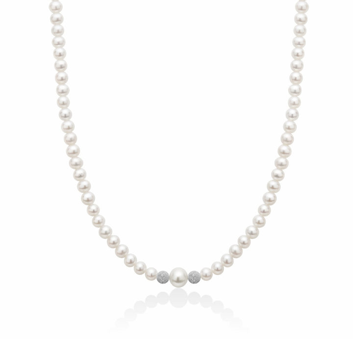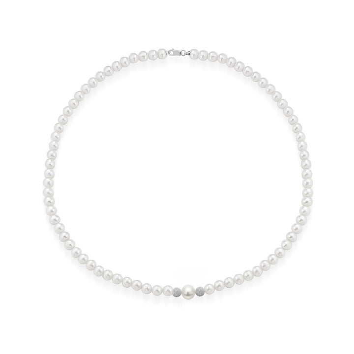 The Timeless Elegance Freshwater Pearl Necklace by Unaloe is a delicate and sophisticated piece. The necklace features lustrous 4mm natural pearls with a striking 8mm center pearl, all complemented by solid 18kt white gold spheres. Its elegant and classic look is perfect for both everyday wear and special occasions.