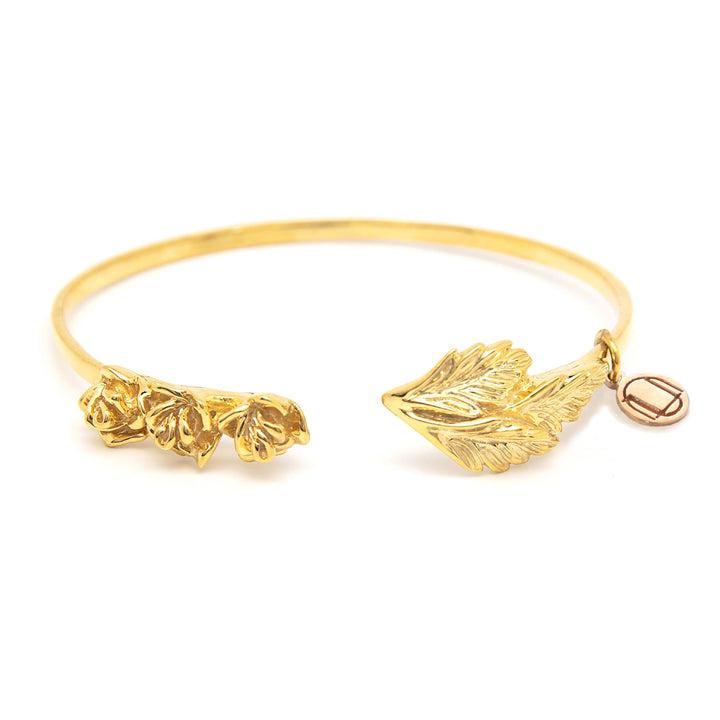 The Floral Unaloe bracelet from the Wild collection is a tribute to Italian craftsmanship and the timeless allure of nature. This bangle-style bracelet features intertwined leaves and three roses, all meticulously handcrafted in Italy. The piece is made of sterling silver and encased in 18k yellow gold (1 micron thickness), with the rose monograms plated in exclusive 14K rose gold. It's a true symbol of Italian refinement.