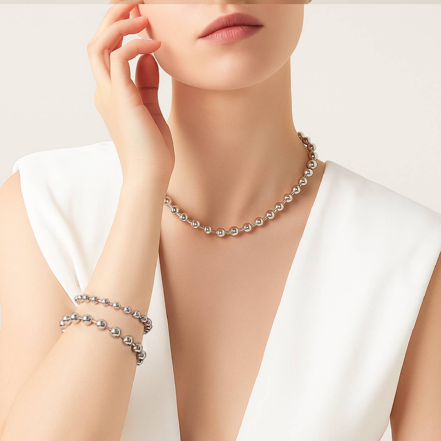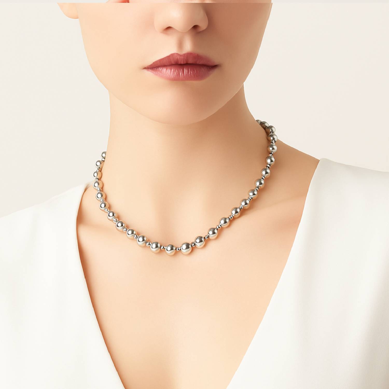 The Sterling Silver Beaded Necklace from Unaloe is a subtle yet elegant piece. It features a minimal and refined design with a sequence of 925 sterling silver beads and rose gold details. The necklace has a polished finish, an adjustable length, and a practical lobster clasp, making it versatile for any neckline and comfortable for both everyday wear and special occasions.