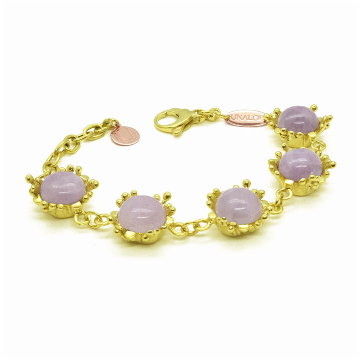 This Bracelet Ribes Gold Plated With Natural Kunzinite by Unaloe is a captivating piece that embodies the essence of life and connection. The central natural Kunzite, a stone of love and emotion, is surrounded by small beads that symbolize the moments that enrich our journey. Its delicate, artisanal design, enhanced by the exclusive Unaloe monogram, makes it a radiant symbol of life's beauty and a treasured expression of individuality. This bracelet is perfect for adding a touch of meaningful elegance to any look.
