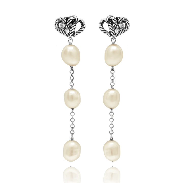 Dangle Earrings With Intertwined Double Hearts And Baroque Pearls – Antiqued Sterling Silver – Jewellery For Women