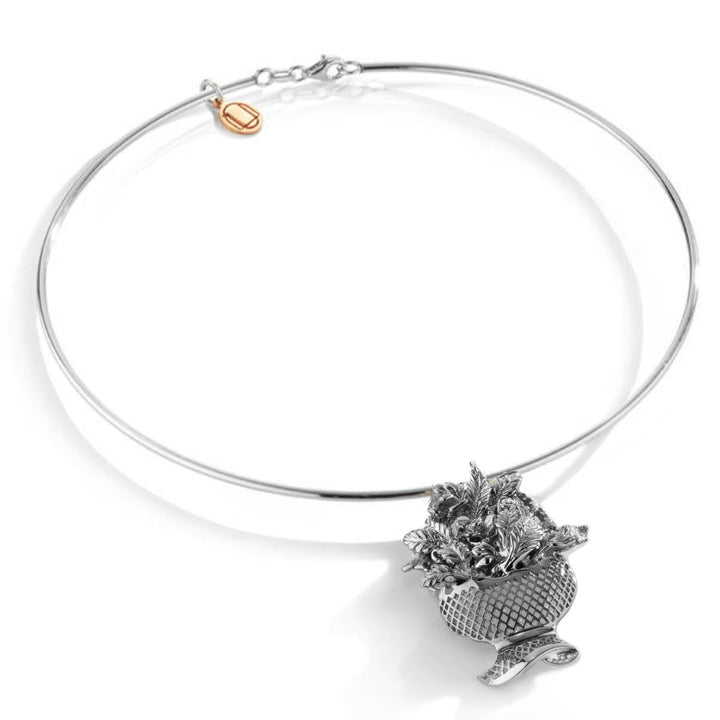 Fiona Choker In Sterling Silver – Rigid Necklace With Sculpted Rose Basket Pendant, Elegant Handmade Jewelry For Women