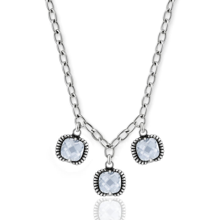 Handcrafted in Italy from 925 sterling silver, this necklace features a trio of blue crystals. The weight of the necklace is 13 grams.