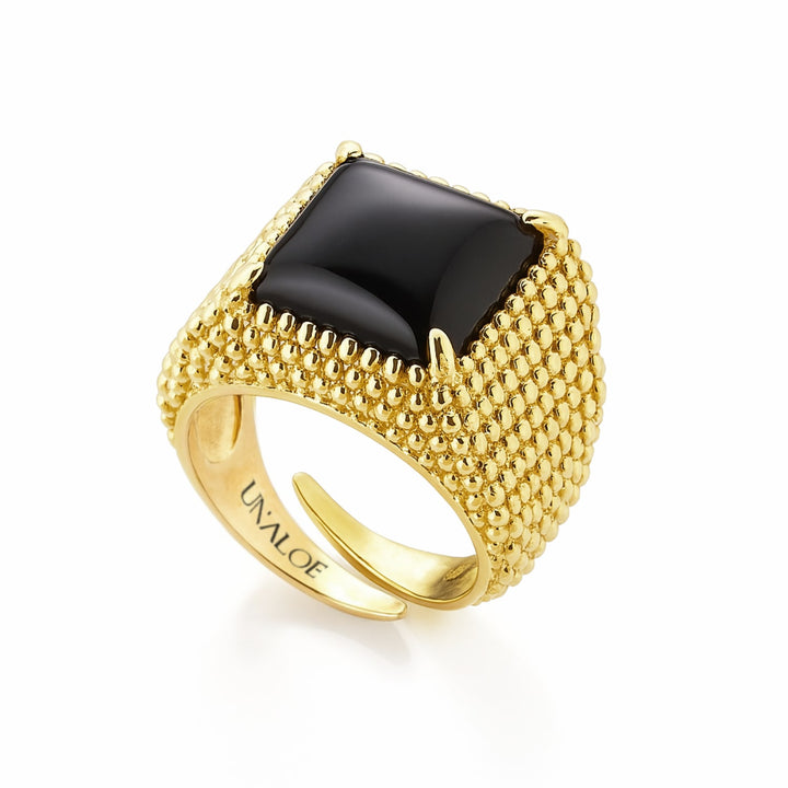 This Unaloe Women's Ring is a bold statement piece that commands attention. Handcrafted with a luxurious gold-plated finish and an elegant beaded texture, this adjustable ring features a striking black onyx at its center. The onyx, a stone of strength and mystery, adds a touch of captivating refinement. This ring is perfect for the woman who embraces bold, modern jewelry that still retains the high-end elegance of Italian craftsmanship. Its adjustability makes it a versatile piece that can be worn on any finger.