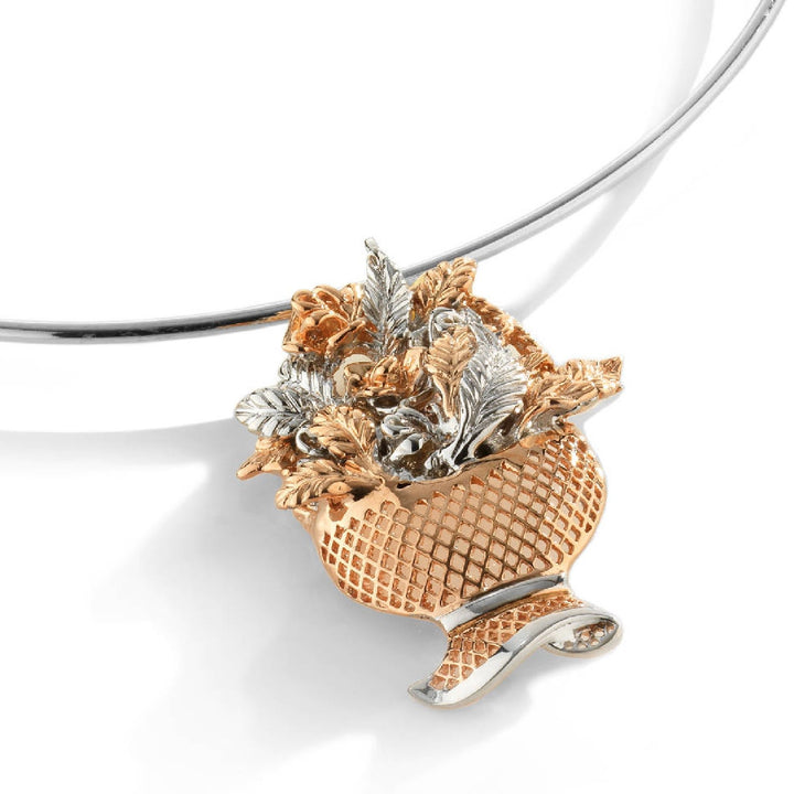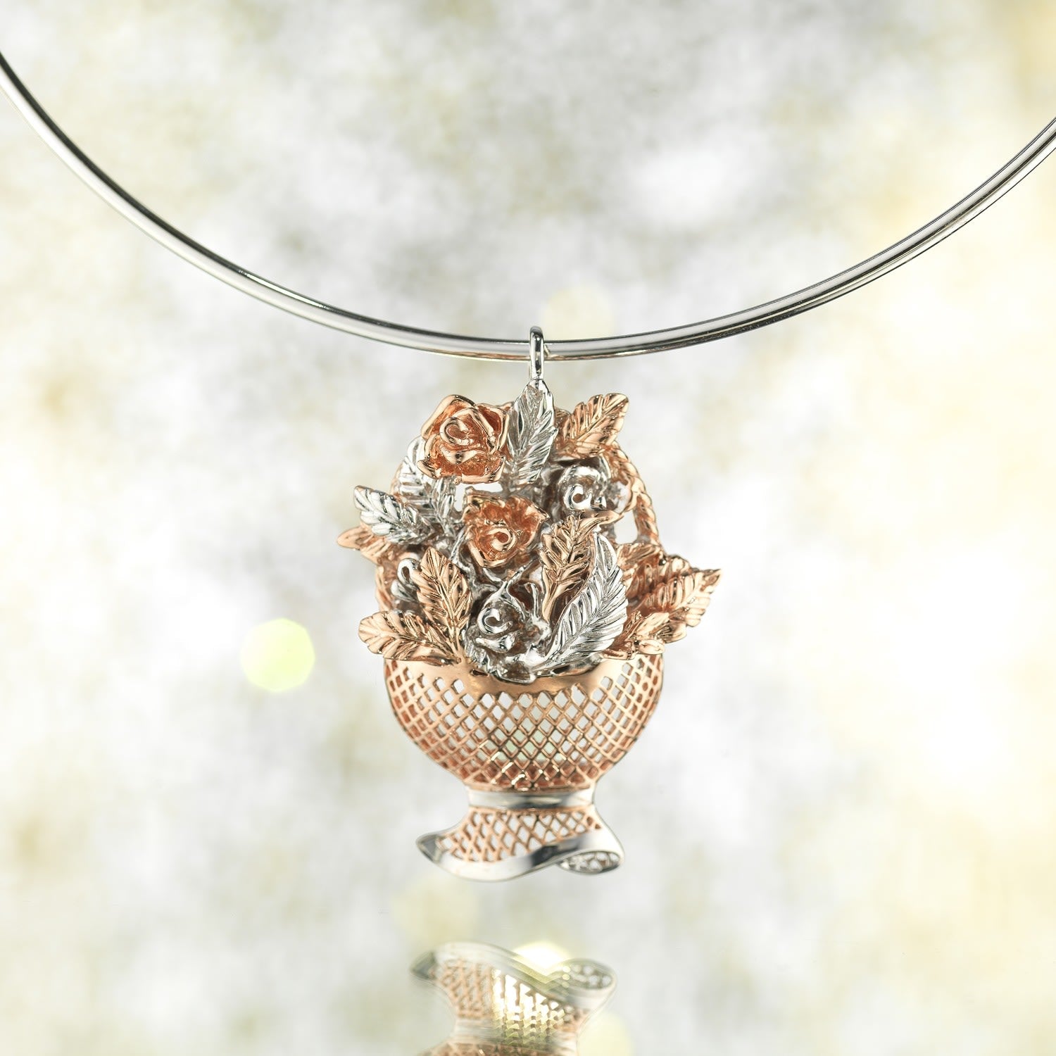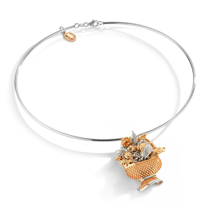 Bicolor Fiona Choker In Sterling Silver With Rose Gold Plating – Rigid Necklace With Sculpted Rose Basket Pendant, Elegant Handmade Jewelry For Women