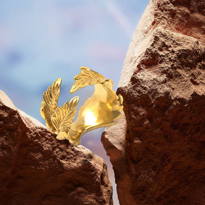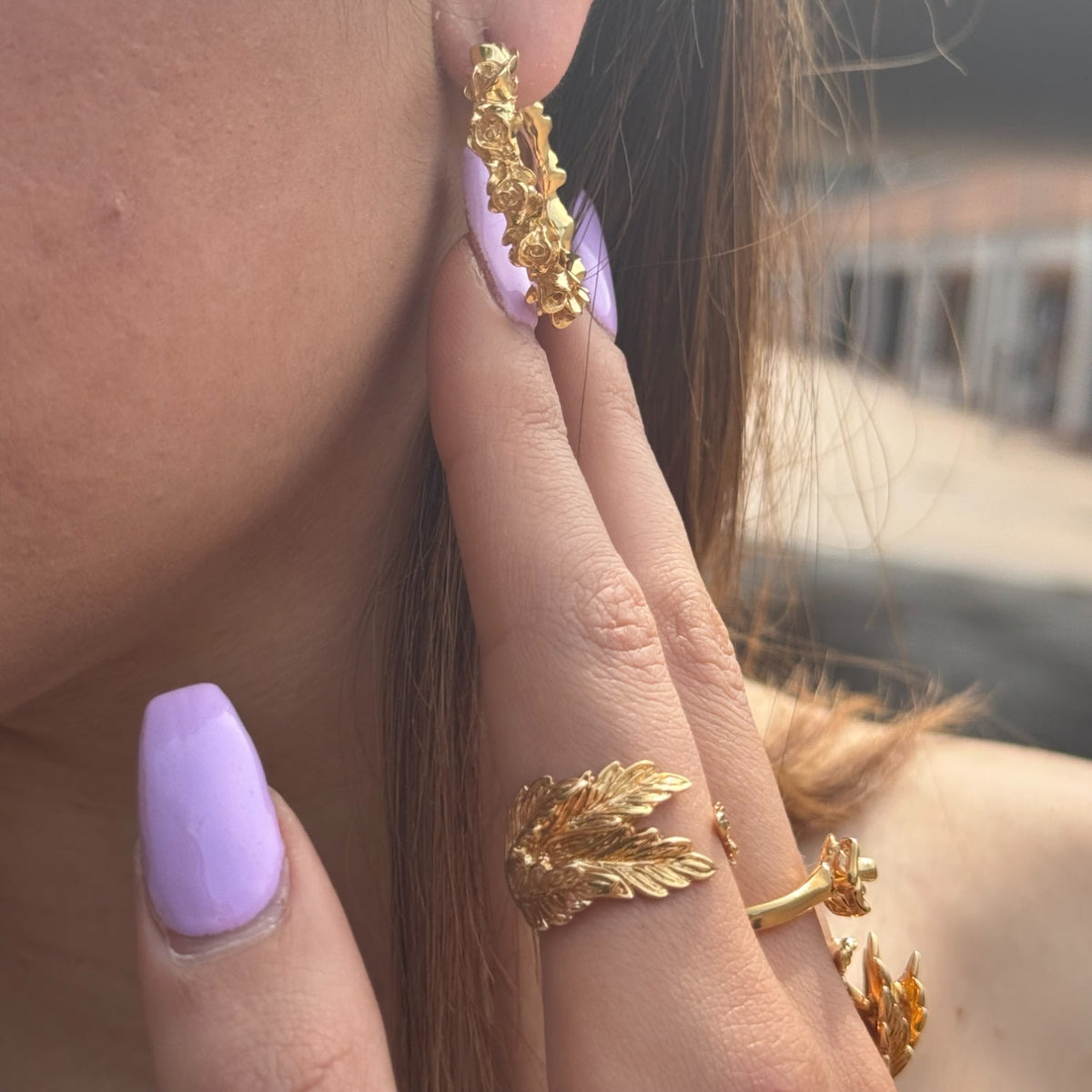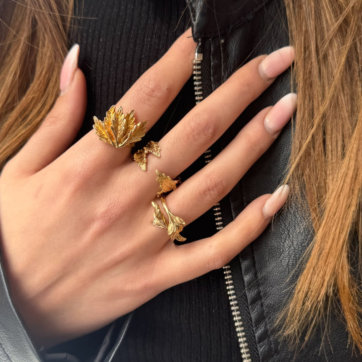 This Gold-Plated Leaves Ring by Unaloe is a beautiful and exclusive piece for nature lovers. The open, intertwining leaves create a harmonious and sophisticated design, while the adjustable band ensures a perfect fit on any finger. Encased in 18k gold over sterling silver, this ring has a unique radiance that makes it an elegant statement piece when worn alone or paired with other items from the Wild collection. It’s a timeless accessory that brings the beauty of the outdoors to your style.