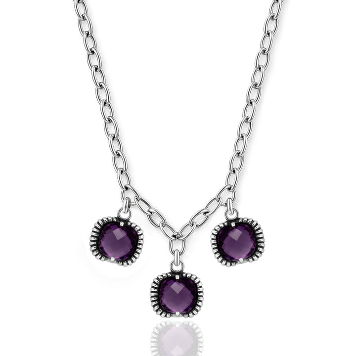 This necklace is handcrafted in Italy from 925 sterling silver and features three purple crystals. The total weight is 19 grams.