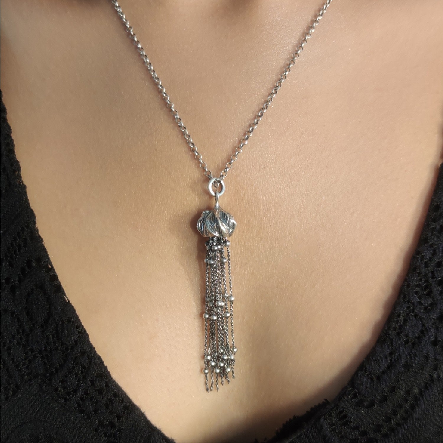 The Zanzibar Unaloe Necklace is an elegant and artistic piece, handcrafted in Italy from 925 sterling silver. It features a bouquet of leaves that support brilliant silver threads with small spheres. The artisanal antiquing technique gives it a touch of authenticity and character. The necklace is a unique statement piece with a timeless charm, perfect for adding a touch of sophistication to special occasions and evening looks.