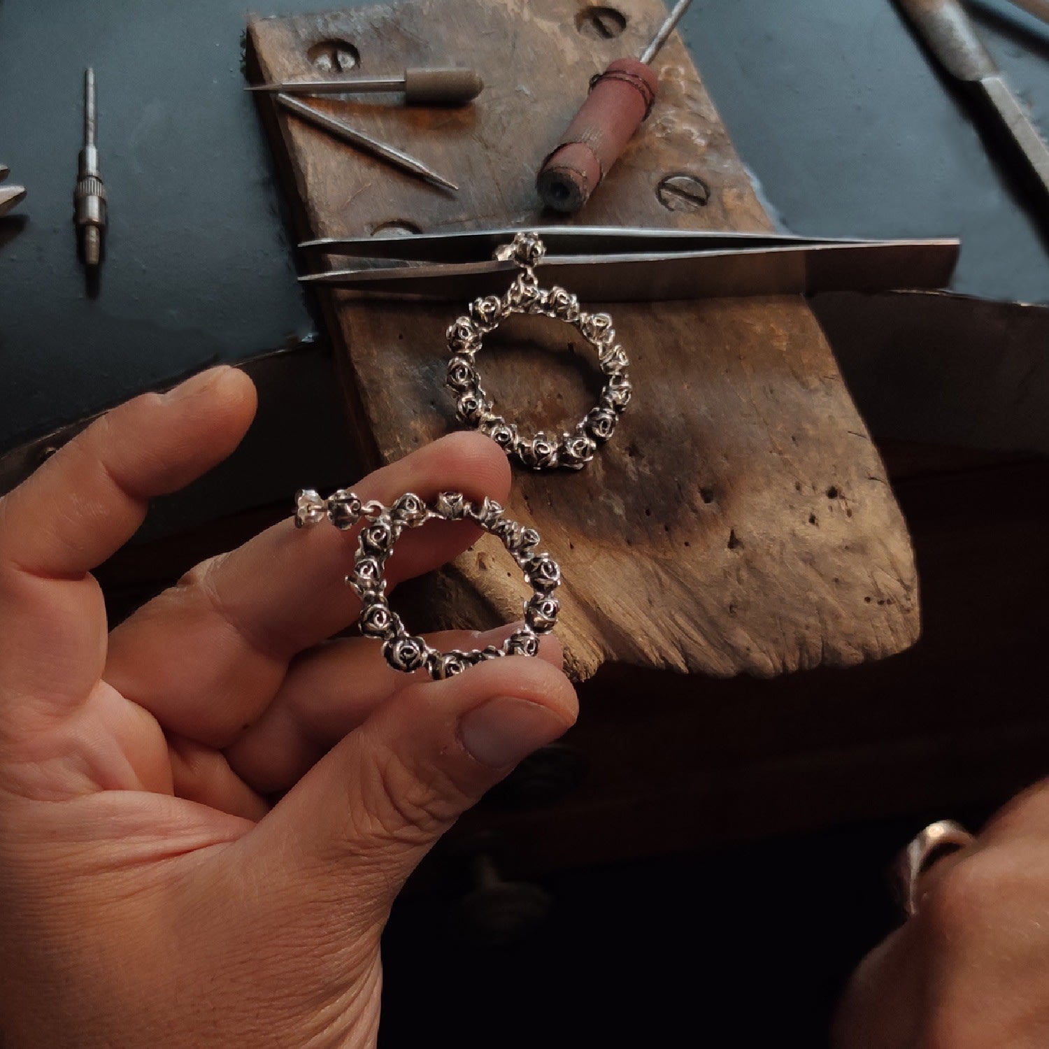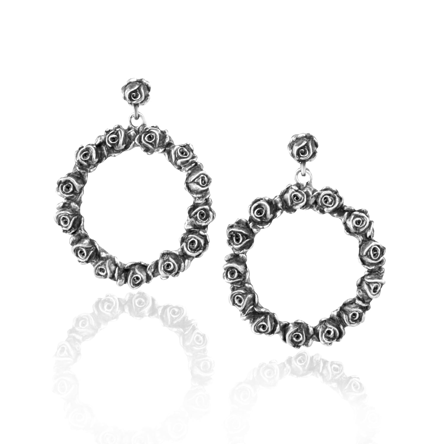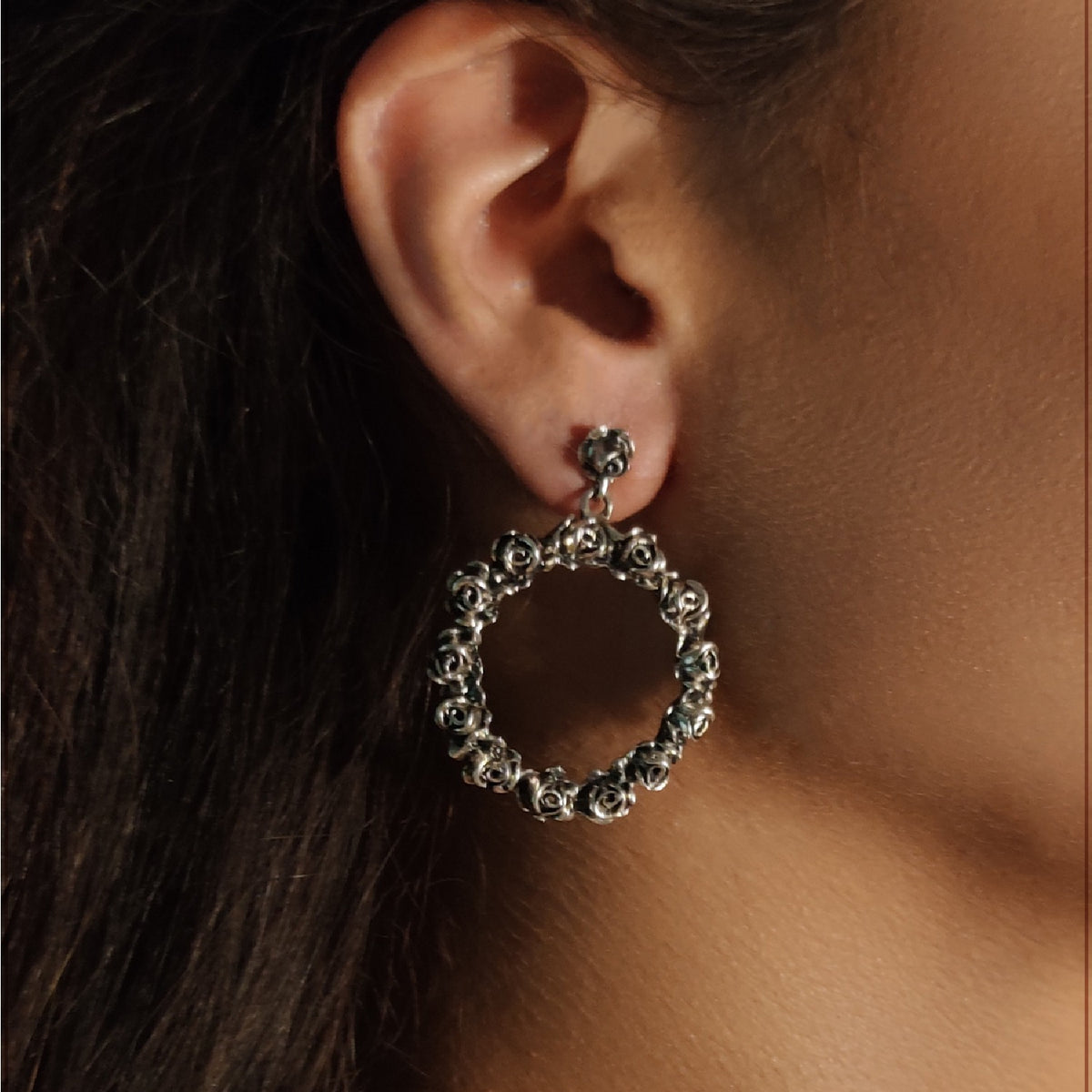 The Circle Sterling Silver Rose Hoop Earrings by Unaloe are a striking and unique vintage-style accessory. Handcrafted in Italy from 925 sterling silver, they feature a small rose at the lobe that supports a circle of fused black Unaloe roses. The artisanal antiquing technique adds authenticity and character, making these hoops a bold and enchanting centerpiece for any look.