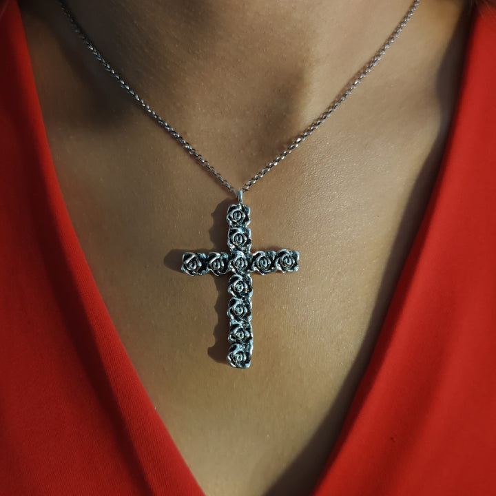 The Cross Belive Necklace by Unaloe is a contemporary take on a classic symbol. Handmade in Italy from 925 silver and gold-plated, this cross is adorned with large Unaloe rosebuds and Unaloe Rosé bronze logos. This unique piece reinterprets the cross with a motif of roses, adding a touch of authentic Italian craftsmanship and elegance to your Wild collection.