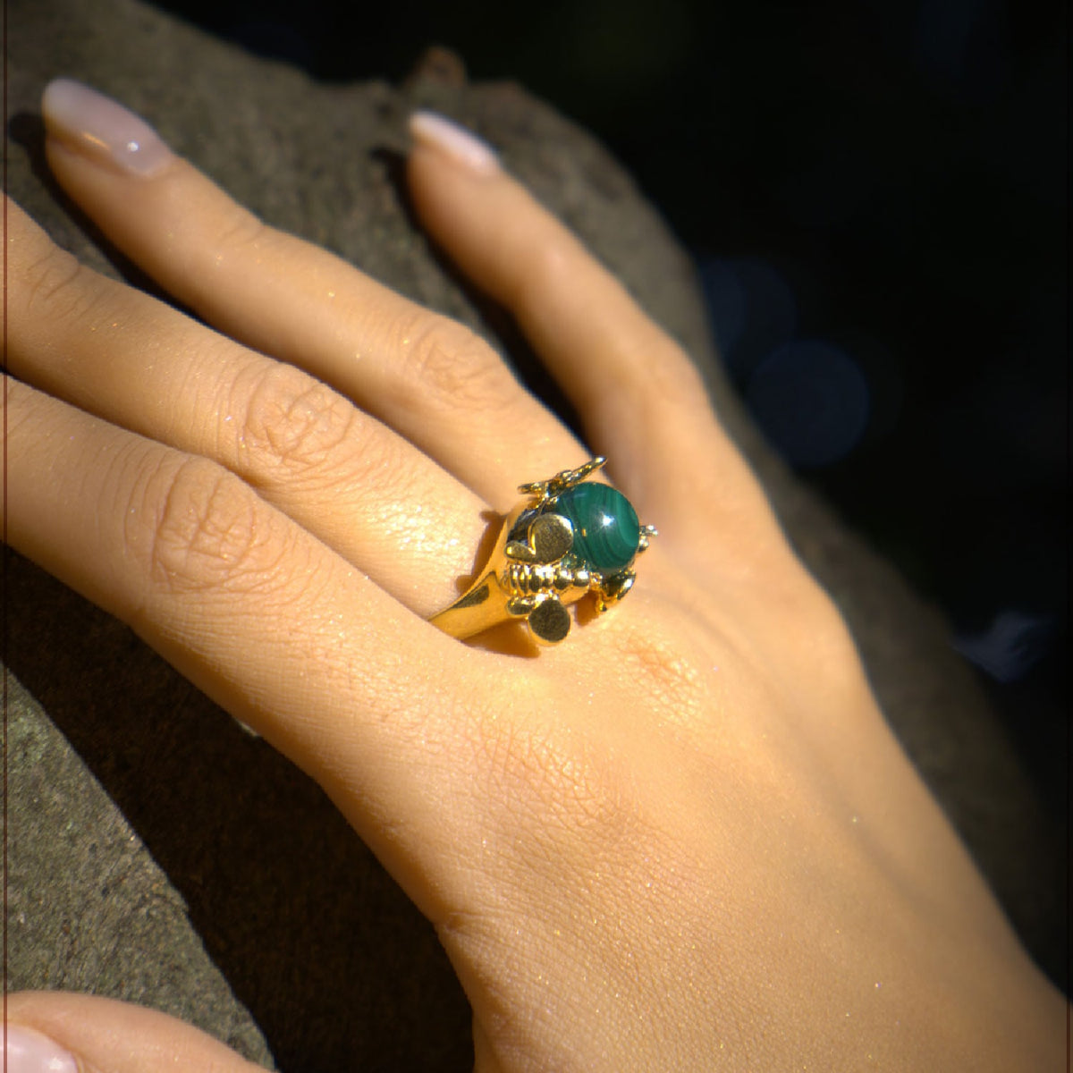 The Natural Queen Silver Ring by Unaloe is a chunky ring that captures the essence of nature and royalty. This piece, inspired by the powerful royalty of the beehive, can be set with a natural green malachite stone. Encased in 18-karat gold over sterling silver, it embodies the harmony between human artistry and natural wonder. It's a unique and meaningful jewel that allows you to choose a stone that reflects your heart.