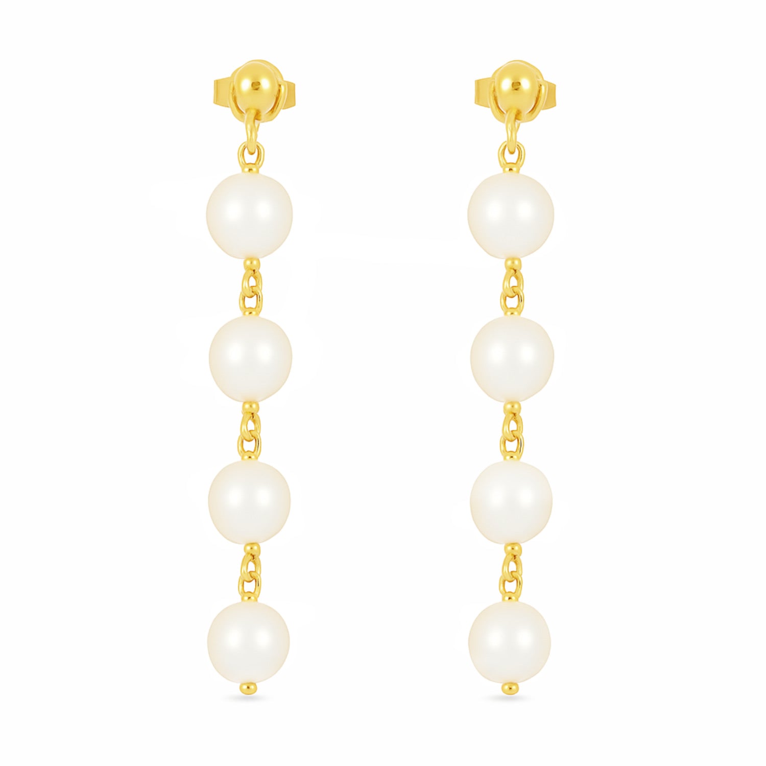 The Gold-Plated Drop Earrings With Pearls by Unaloe embody classic elegance and refinement. Expertly crafted from 925 silver and lavishly plated in 18K yellow gold, these earrings feature four delicate pearls that dangle and sway with every movement. The pearls are carefully selected for their luster, adding a luxurious and feminine touch to any outfit.
