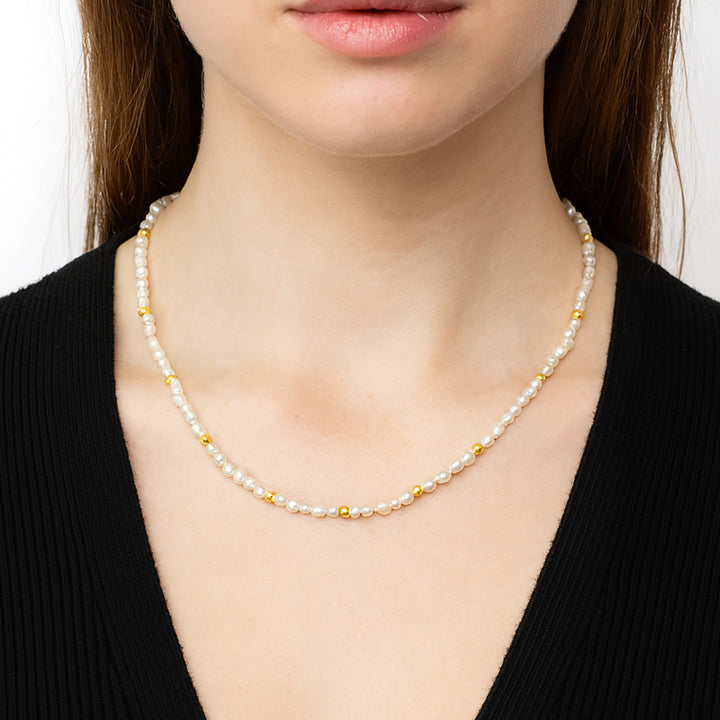 The Baroque Natural Pearl Necklace With Gold-Plated Sterling Silver Spheres by Unaloe is a luminous and sophisticated piece. This necklace combines natural baroque pearls with 18K gold-plated sterling silver beads, creating a refined and elegant look. Its adjustable length makes it versatile, perfect for a discreet look or for layering with other jewelry.