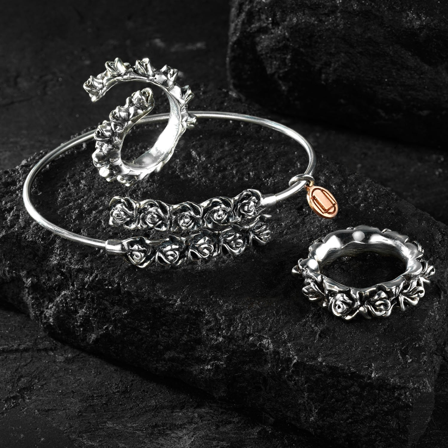 The Black Rose Buds Ring Sterling Silver by Unaloe, also known as the Desirè Ring, is an elegant, adjustable ring with a boho-chic style. Handcrafted in Italy from 925 sterling silver, it features an oxidized vintage finish and is decorated with Unaloe rose buds that give it a timeless charm. Its asymmetric design is harmonious and unique, perfect for wearing alone or paired with other rings.