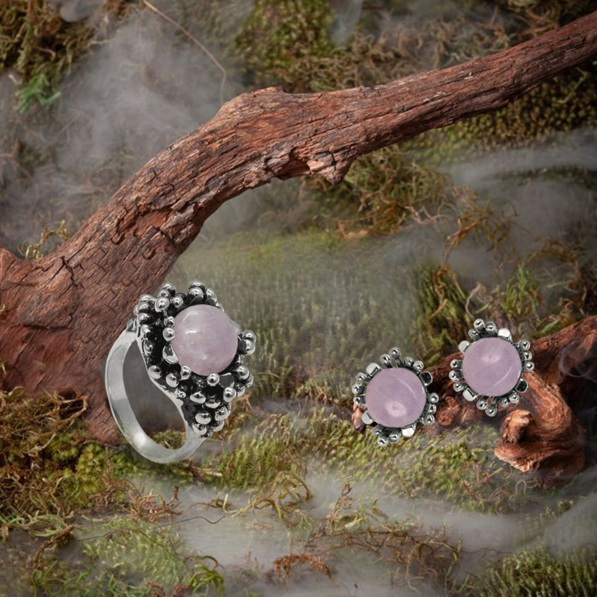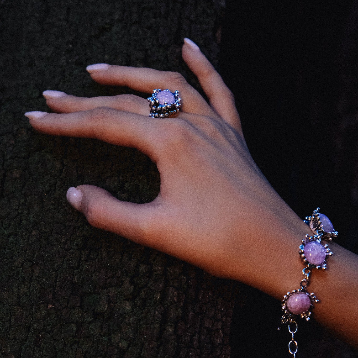 The Ribes Silver Ring by Unaloe is a jewel that celebrates life and diversity. Coated in gold over sterling silver, it features a natural kunzite stone at its center, which represents the heart of our existence. The delicate pink hue of the kunzite symbolizes emotional healing and love, making this ring a tangible and beautiful expression of empathy and affection.
