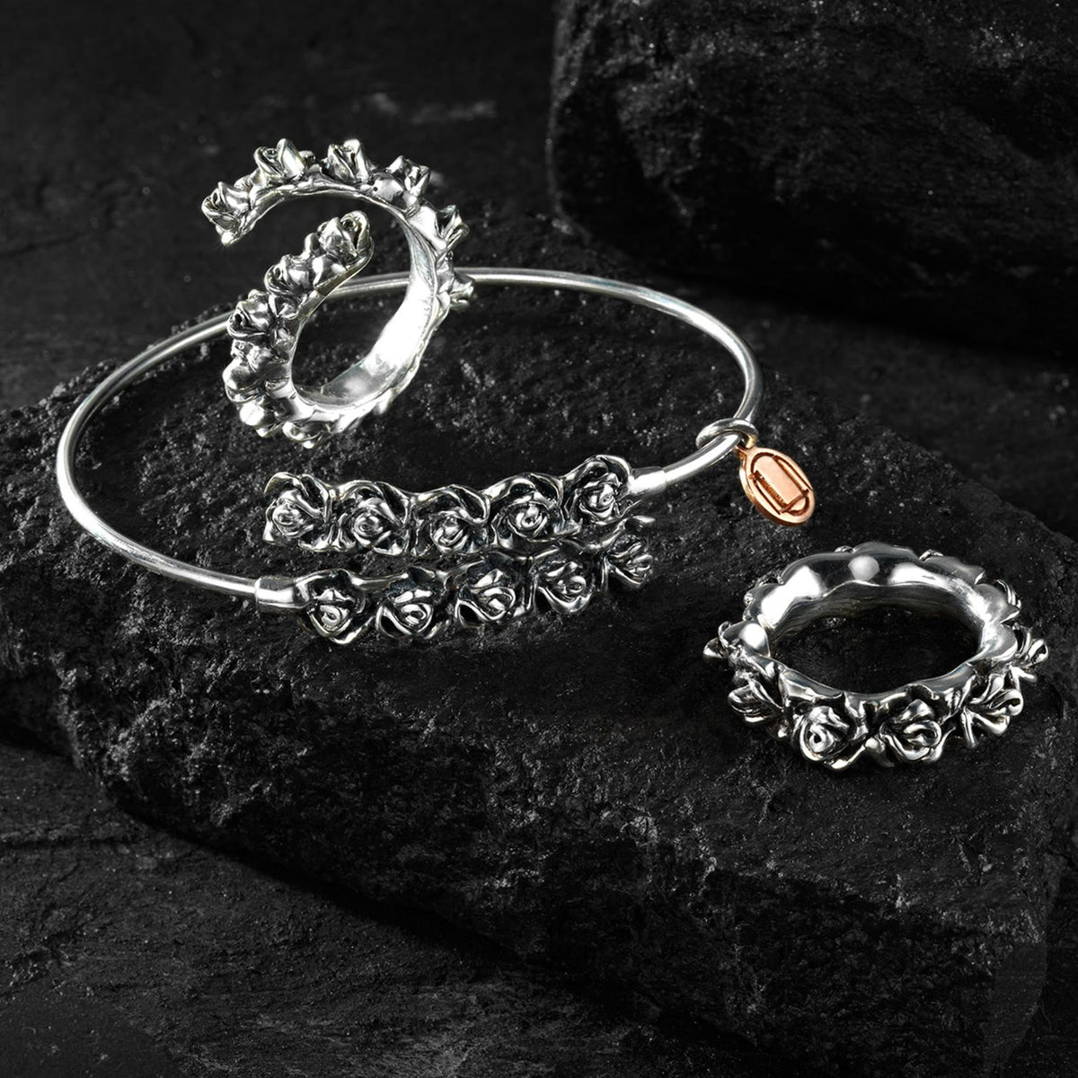 This Contrary Sterling Silver Bracelet by Unaloe is a tribute to the timeless allure of wild nature. Handcrafted in Italy, the bracelet features a contrast of ten black Unaloe roses at its center, which beautifully reflect light and add a touch of brilliance. Made from sterling silver with a brunished finish, the piece has a timeless effect of depth and refinement. It’s not just an accessory, but a symbol of Italian refinement.