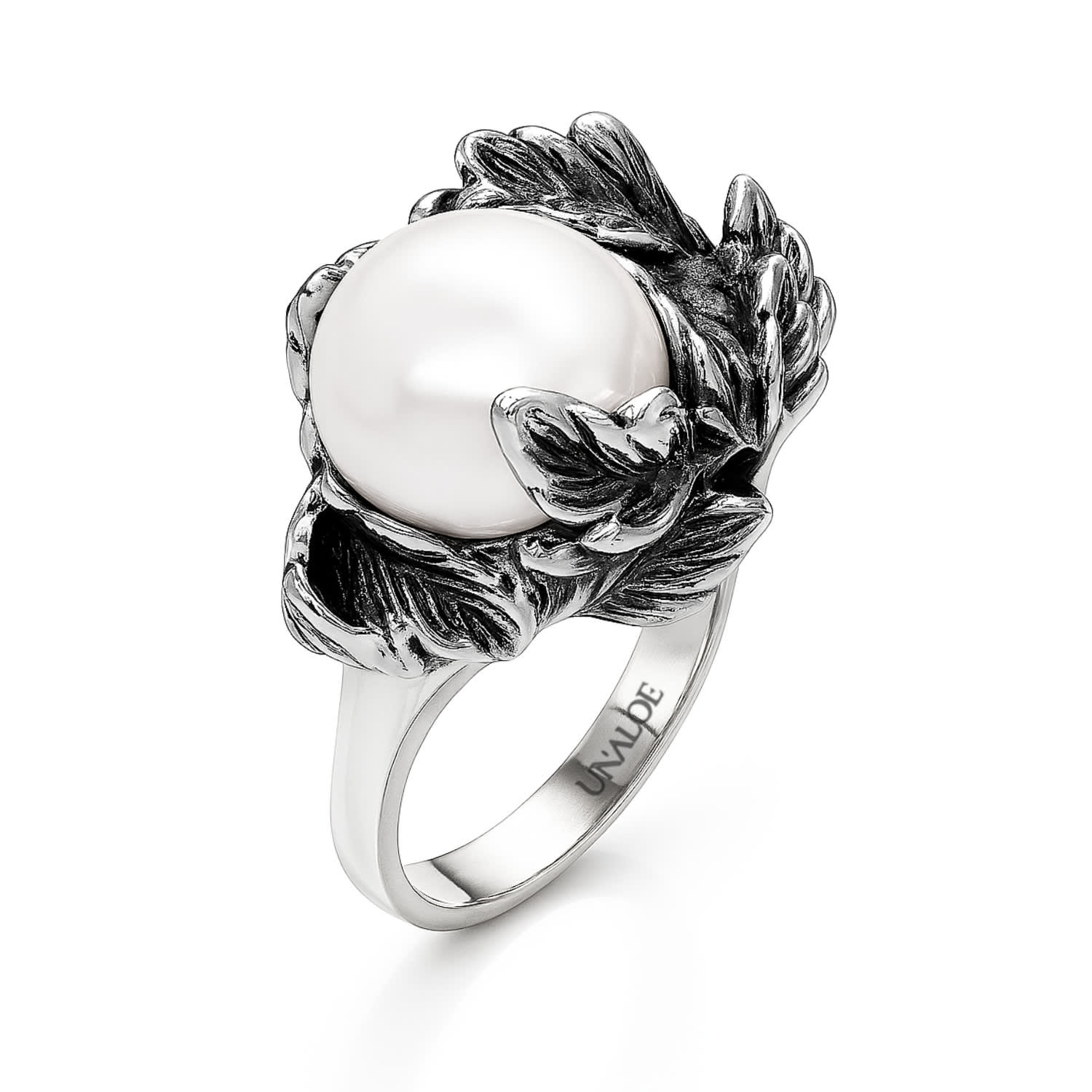 The Lumina Ring by Unaloe is a unique work of art that beautifully captures the essence of life's beauty. Hand-forged in Italy from sterling silver, its delicate leaves intertwine around a central natural pearl, which symbolizes purity, hope, and transformation. The antiquing technique adds a dark patina, giving the ring an authentic, timeless quality. This piece reminds us that even from adversity, priceless treasures and inner beauty can be found.