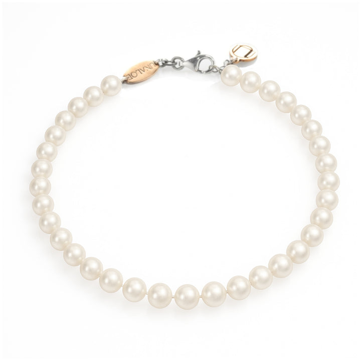 This necklace is handcrafted in Italy from 925 sterling silver. It features natural pearls (5-7mm diameter) and Unaloe rose monograms. The piece is nickel-free.