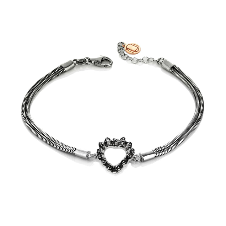 The Loveyou Sterling Silver Bracelet by Unaloe is a romantic and elegant accessory. Handcrafted in Italy, the bracelet features a heart composed of small rosebuds, supported by a double snake knit thread for a modern touch. Made from brunished sterling silver with rose gold plated monograms, this piece is a timeless symbol of love and Italian refinement.