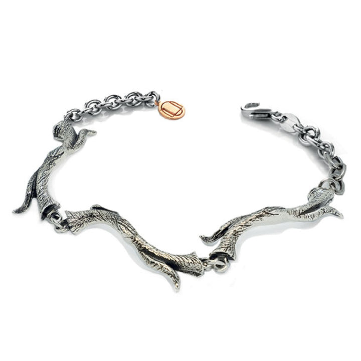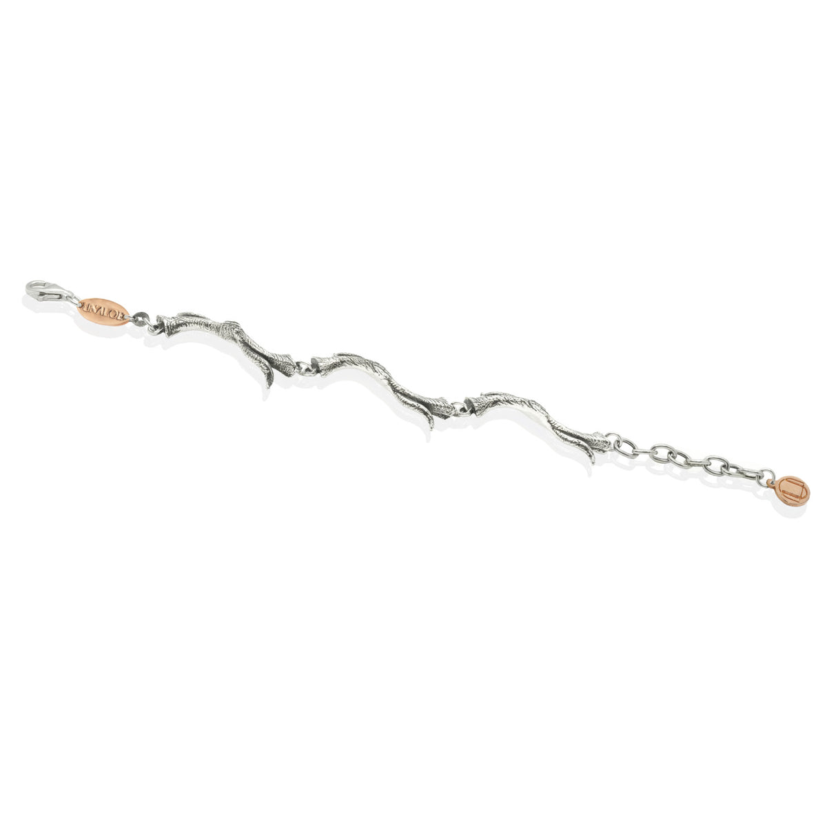 This bracelet is handcrafted in Italy from brunished 925 sterling silver. It is embellished with 14k rose gold plated Unaloe monograms and weighs 12 grams. It is nickel-free.